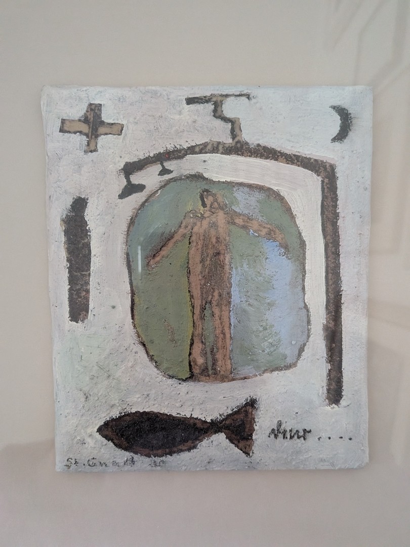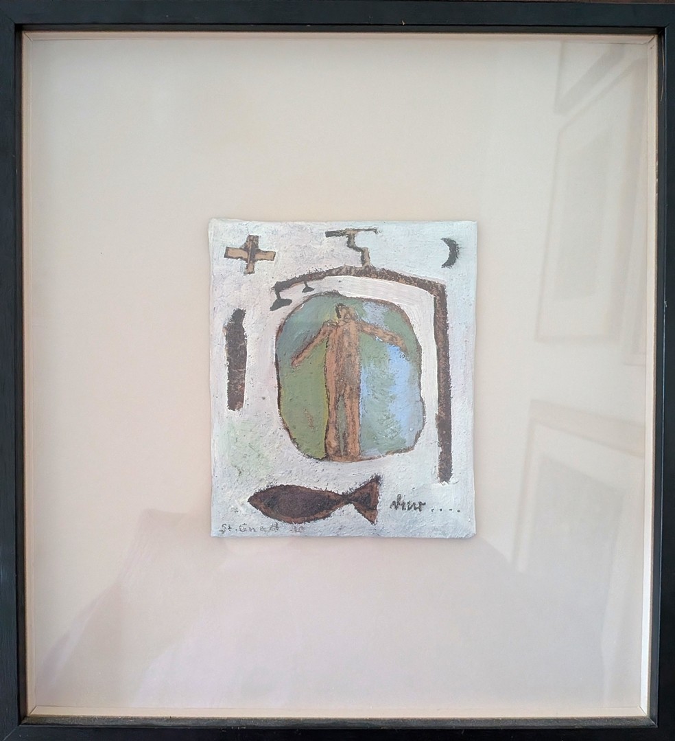 Gnad, Stefan (geboren 1955) Tür, 2020, Öl auf Karton. Es handelt sich um ein kleines, gerahmtes Bild, das eine stilisierte menschliche Figur in einem Bogen darstellt. Weitere Symbole sind ein Kreuz, ein Fisch und ein Halbmond. Die Inschrift "deur...." könnte ein niederländisches Wort für "Tür" sein.