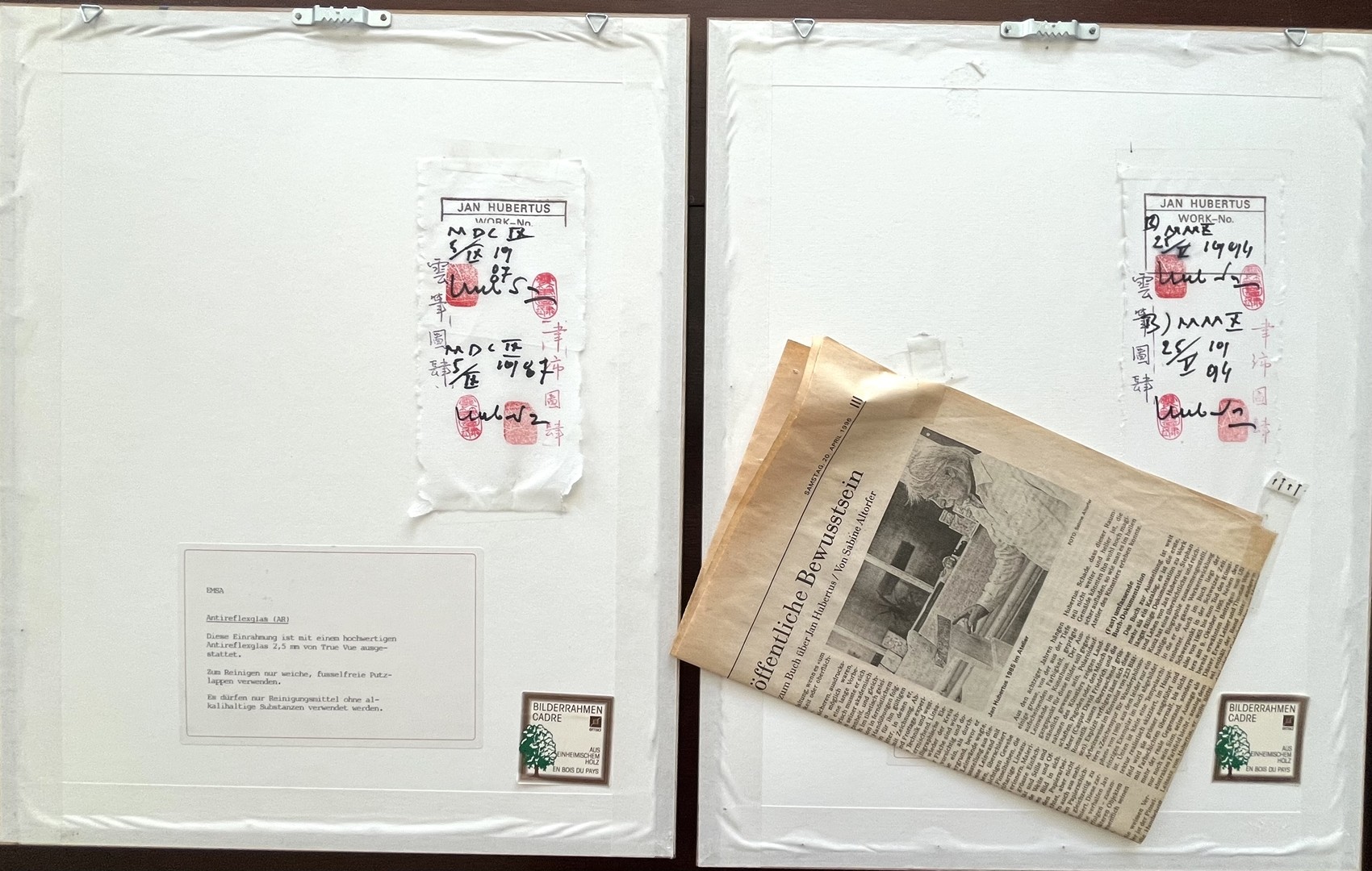 Los 545 - Hubertus, Jan (1920-1995) Fernöstliche Inspiration, 1987, zwei Collagen. Schriftzeichen auf Papier gemalt, dieses wiederum aufgeklebt. Ästhetische Darstellung.