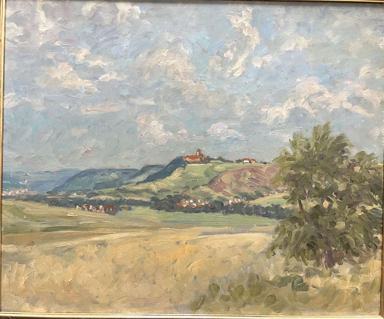 Los 556 - Kübler, Otto (1907-1997) Blick zur Achalm, Öl auf Platte. Weitläufiges Feld, im Hintergrund die Achalm.