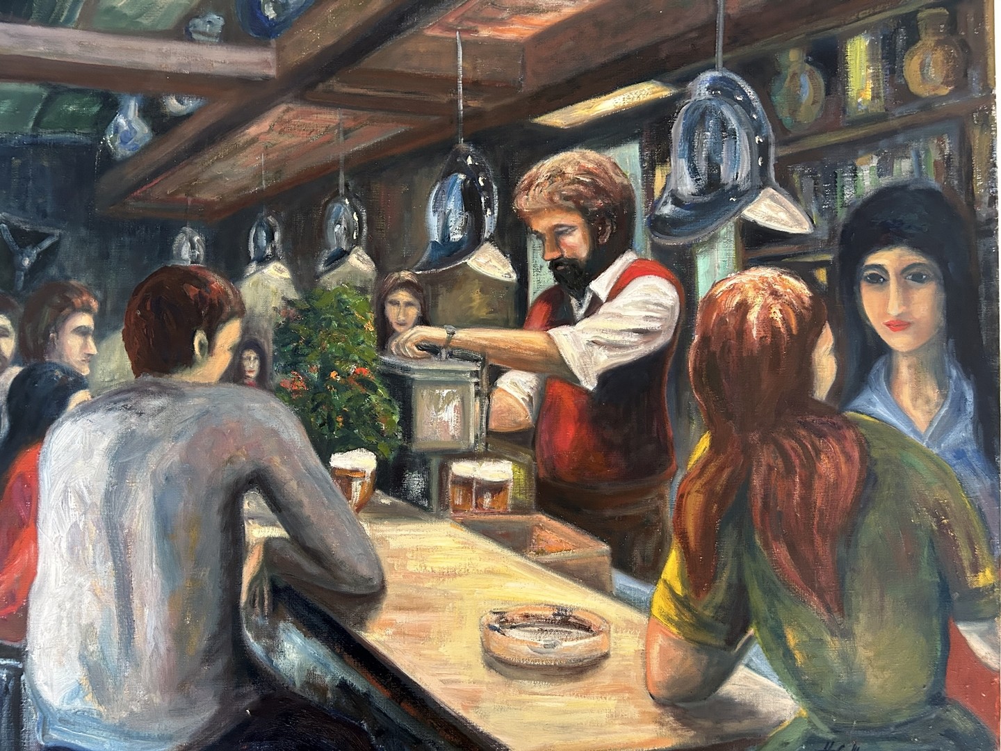 Das Ölgemälde gestaltet eine warme Atmosphäre der Gastronomie "Burghof" in Wallhausen. Während der Wirt am Tresen ausschenkt, unterhalten sich die Gäste um ihn herum.