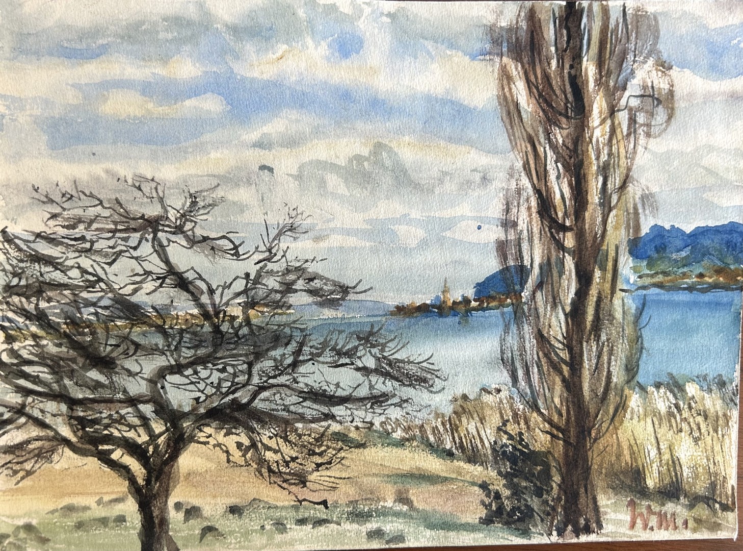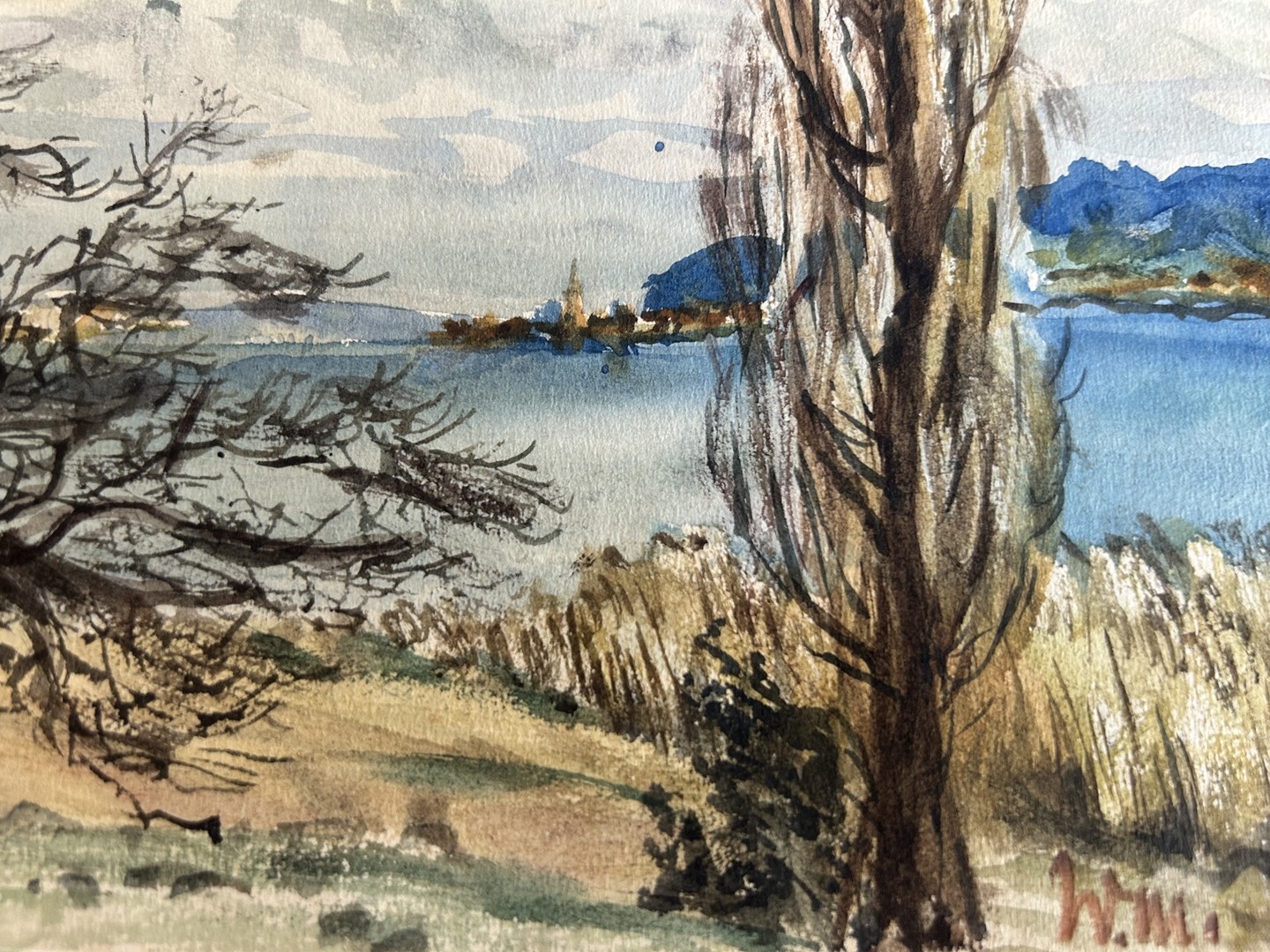 Das größere Aquarell zeigt einen erhöhten Blick auf einen ruhigen Strang des Bodensees. Dabei führt die Landstraße am See entlang, sodass die weite bewachsene Landschaft zum Ausdruck kommt. Das kleinere Aquarell eröffnet, versteckt zwischen zwei Bäumen, einen weiten Blick über den See hin zu einem Dorf an der gegenüberliegenden Seite.