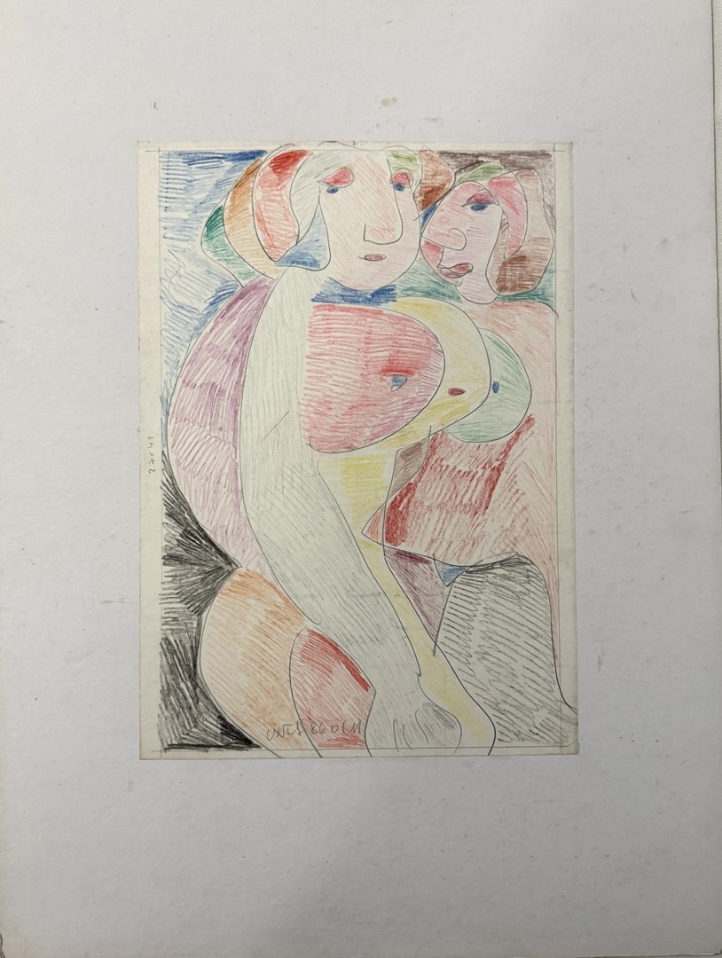 Die Buntstiftzeichnung zeigt zwei Damenakte in kräftigen Farben und zeigt Némeths typischen Stil.