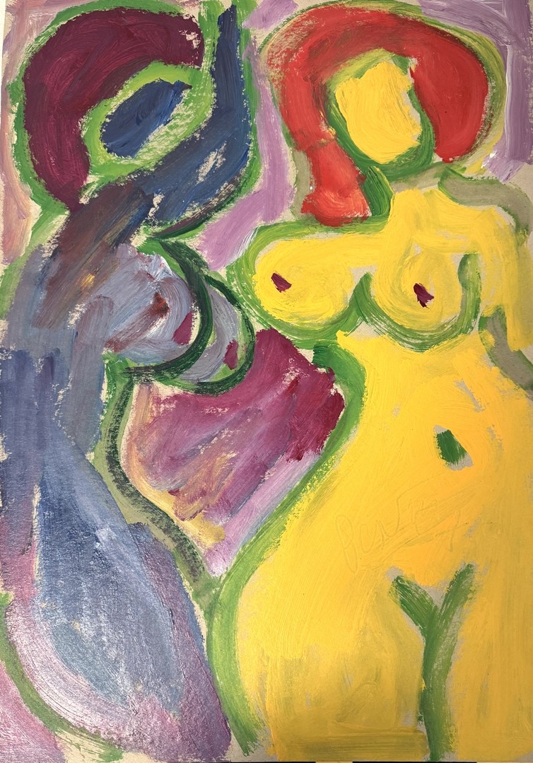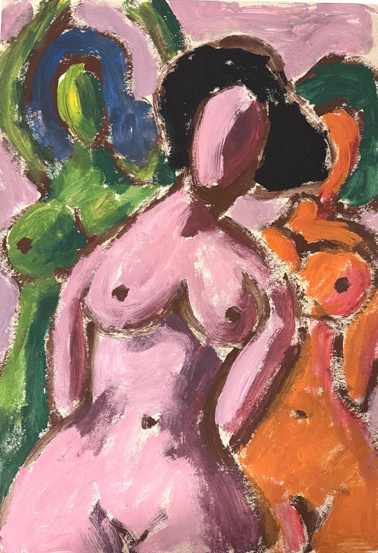 Die beiden Damenakte sind in einer für Németh typischen Farbgebung gemalt: Die satten Lila-, Rot- und Grüntöne unterstreichen dabei die Figuration.