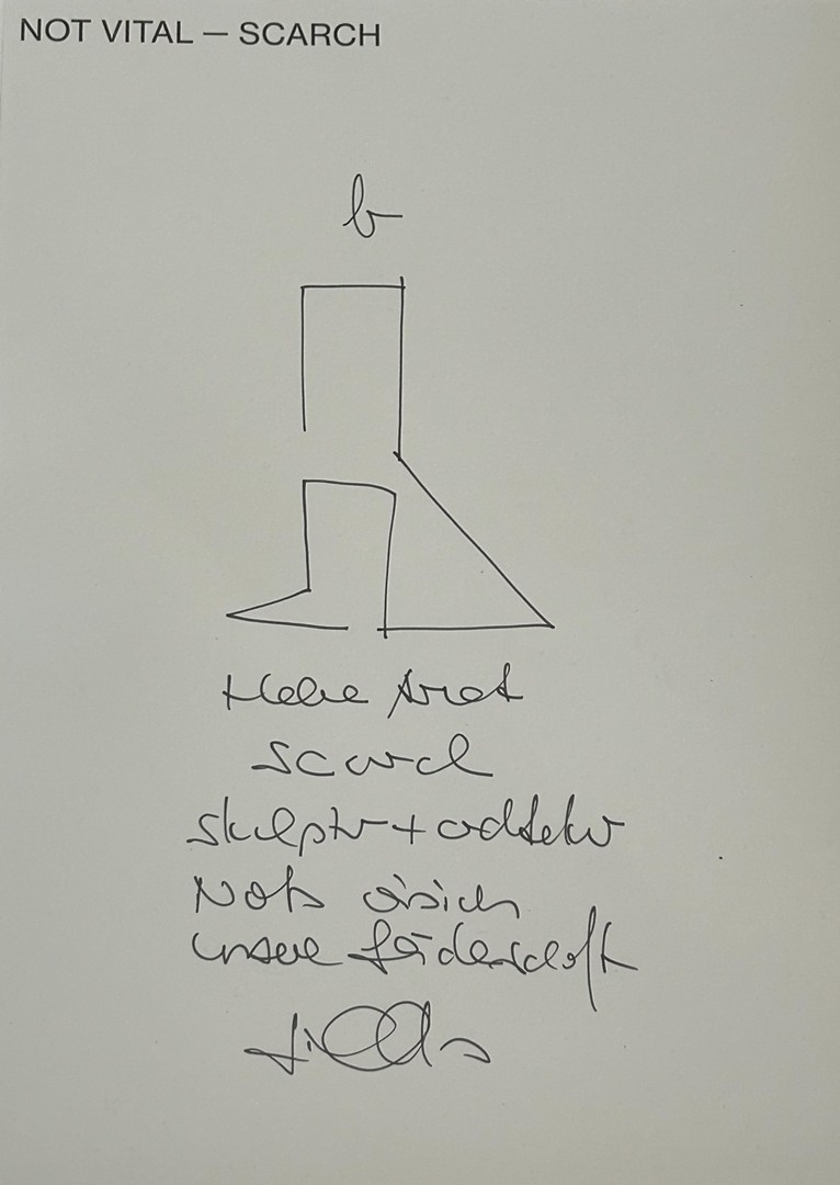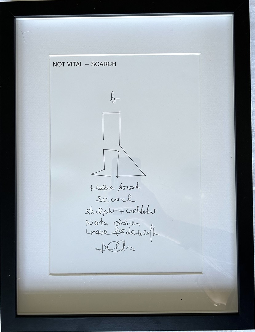 Die minimalistische Zeichnung auf weißem Grund zeigt eine schwarze, zweidimensionale Form unter der eine Widmung des Künstlers beigefügt ist.