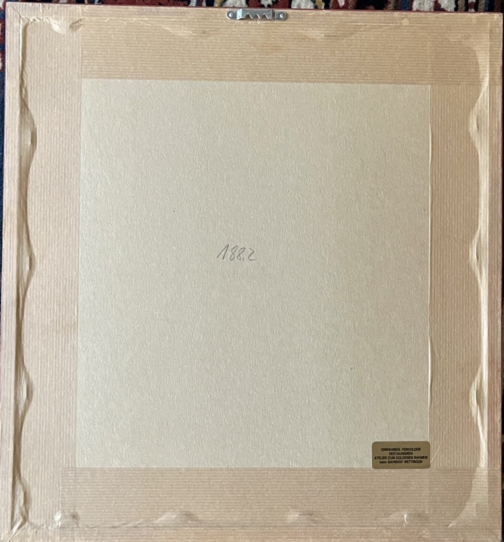 Druckplatte 13 x 12 cm, unter Glas gerahmt 36,5 x 34 cm.