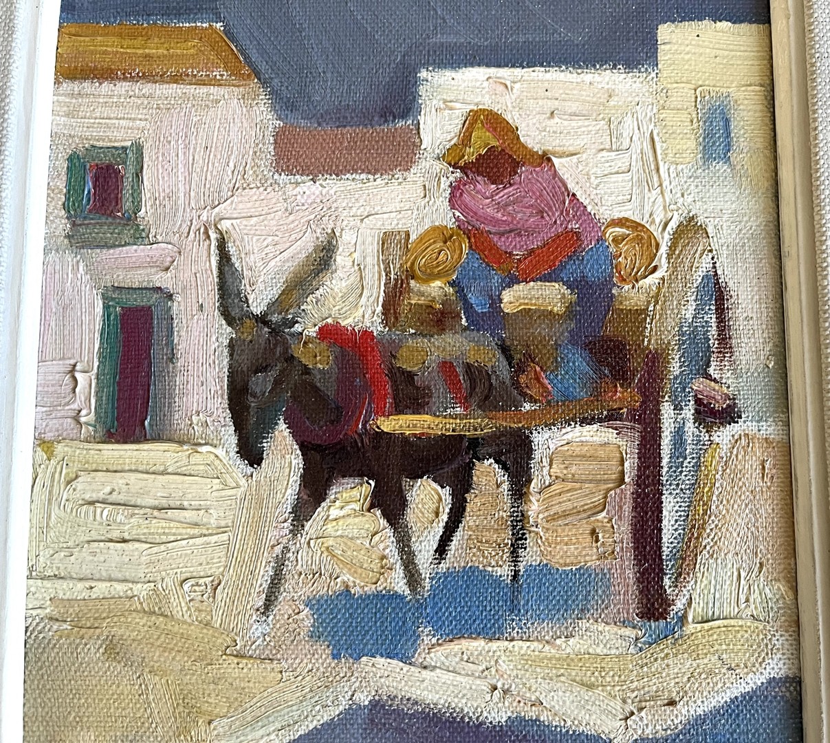 Oppenheim-Jonas, Edith (1907-2001) Eselfuhrwerk, Öl auf Leinwand. Bunte, idyllische Darstellung eines beladenem Eselfuhrwerks mit einer Person.