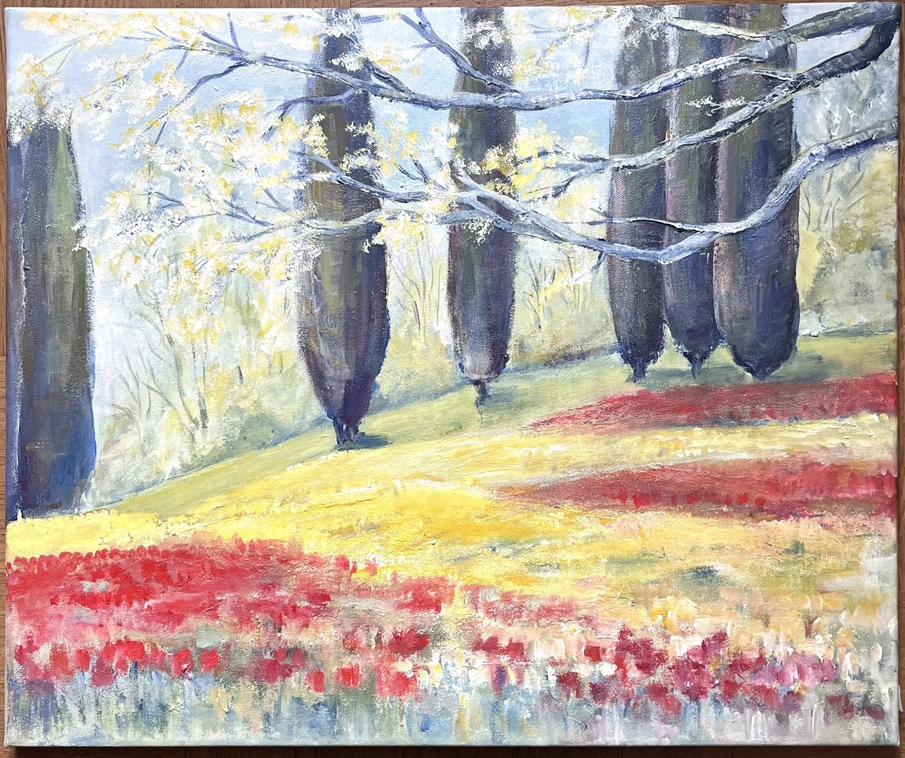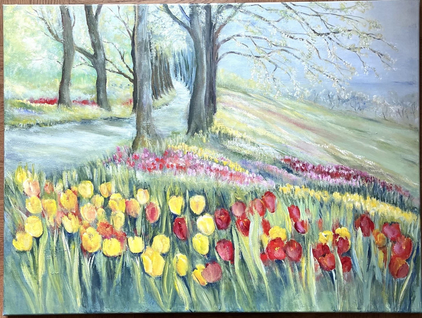 Das Konvolut aus zwei Ölbildern und einer Mischtechnik zeigt ein florales Ambiente in Zusammenspiel mit einer frühlingshaften Landschaft.