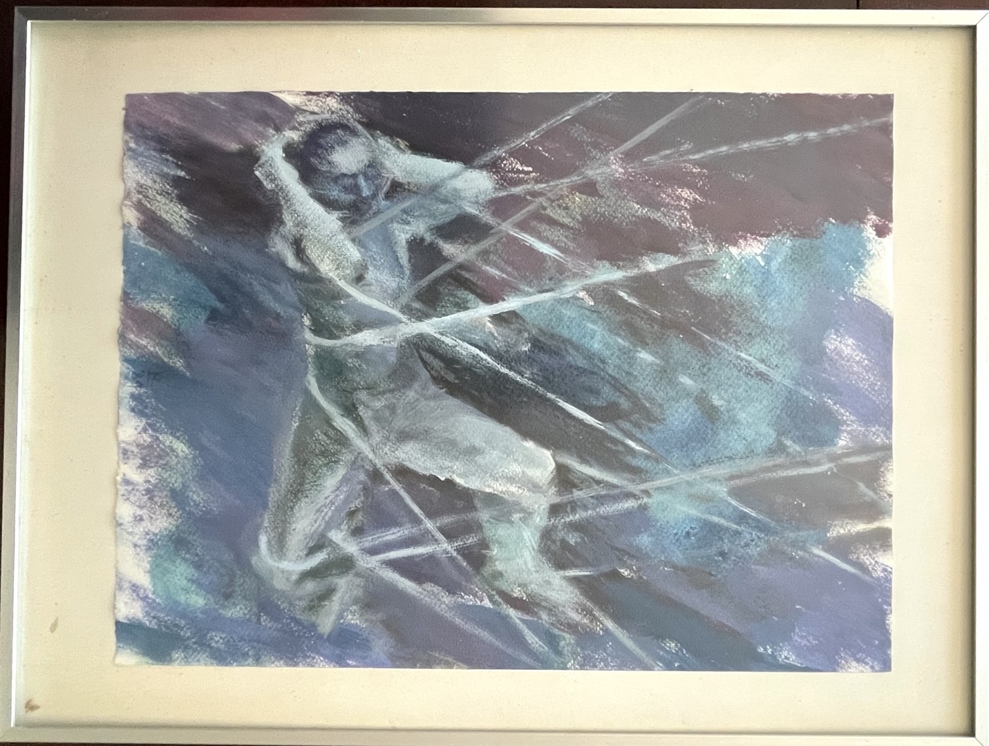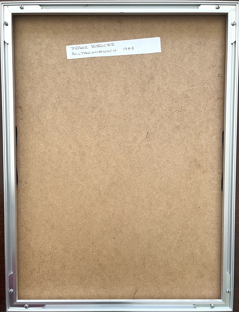 Los 601 - Rüegger, Franz (1946 geboren) "Alltagsmensch", 1984, Acryl auf Malpapier. Darstellung einer Person, die gefangen ist in Netzen und versucht sich aus diesen zu befreien.