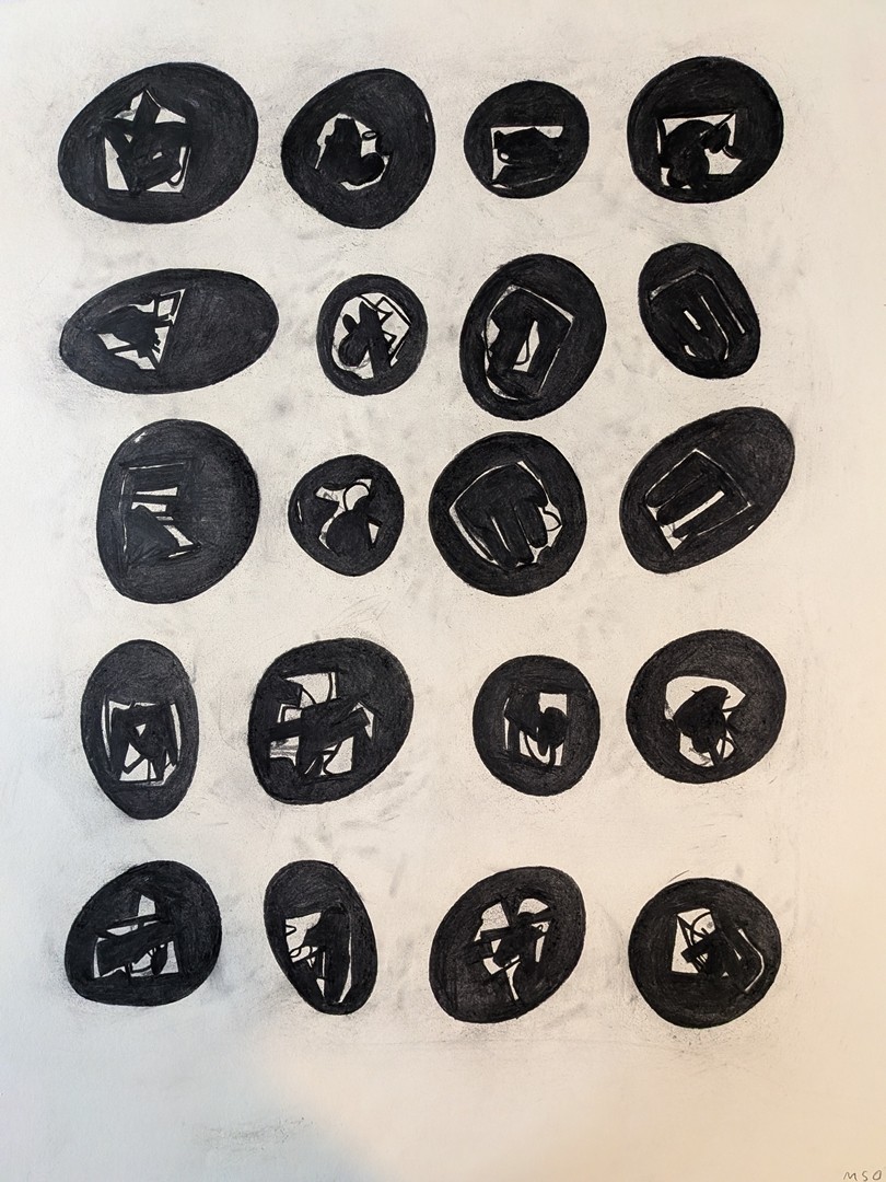 Schönholtz, Michael (1937-2019) "Relativ 4", 2006, Kohlezeichnung auf Papier. Eine abstrakte Zeichnung von Michael Schönholtz, die durch die Wiederholung von 20 dunklen, unregelmäßigen, fast ovalen oder blockartigen Formen gekennzeichnet ist, die jeweils innere, helle, skulpturale Strukturen aufweisen.