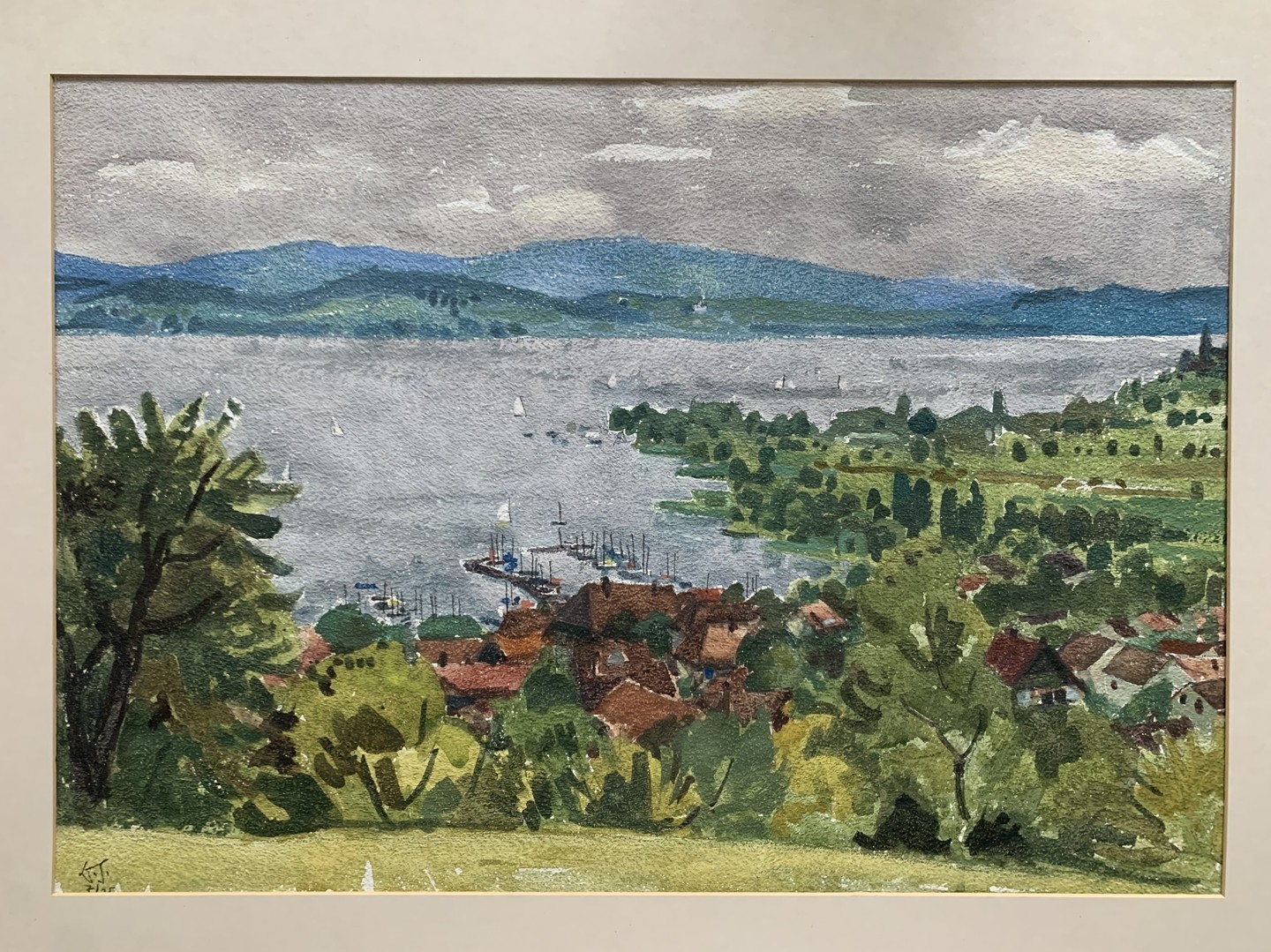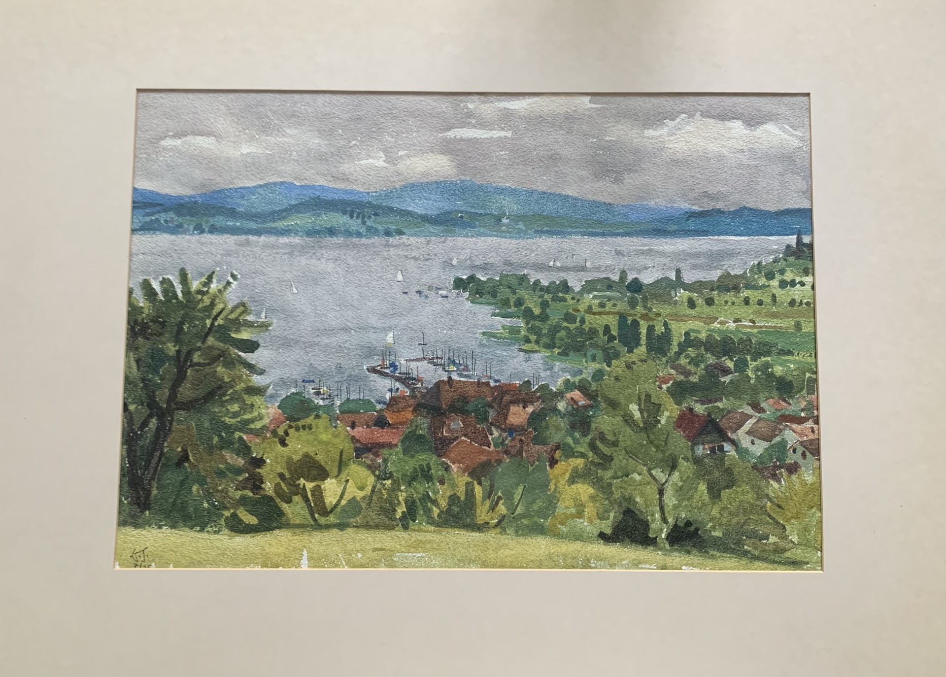 Landschaft mit See und Dorf, 1975, Aquarell auf Papier. Unten links signiert und datiert. Bild 42 x 61 cm, Passepartout 61 x 85cm.
