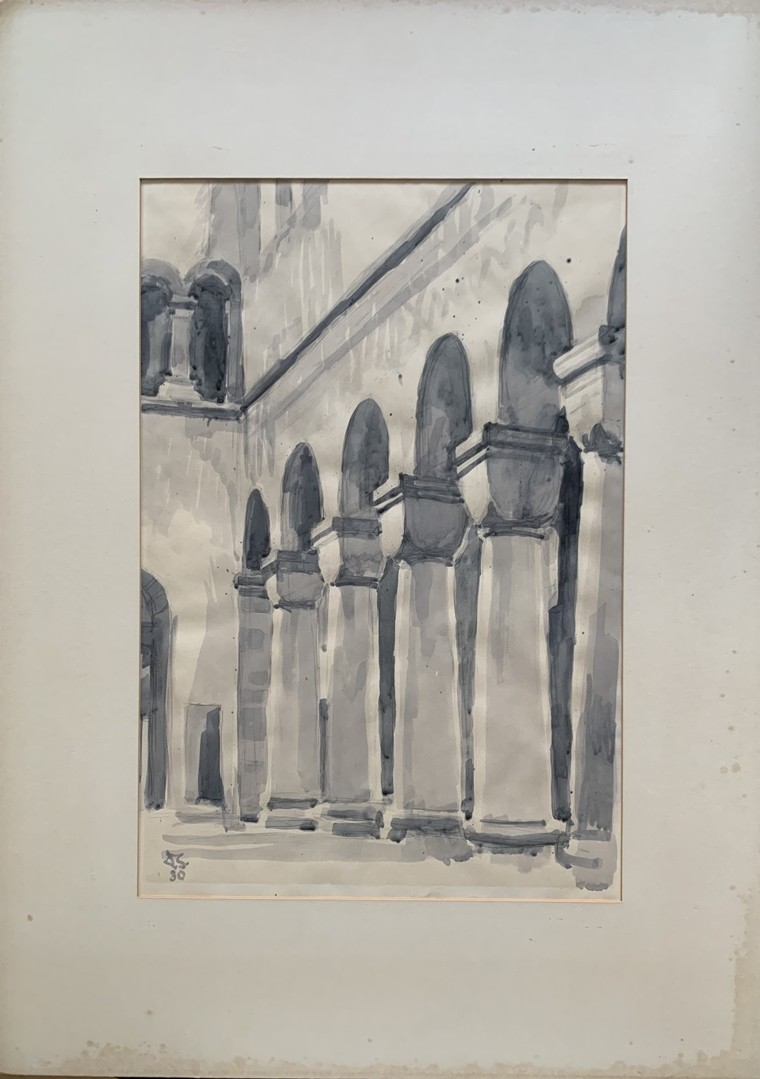 Architekturstudie mit Arkaden, 1980, Tusche auf Papier. Unten links signiert und datiert. Bild 57 x 39 cm, Passepartout 86 x 59 cm.