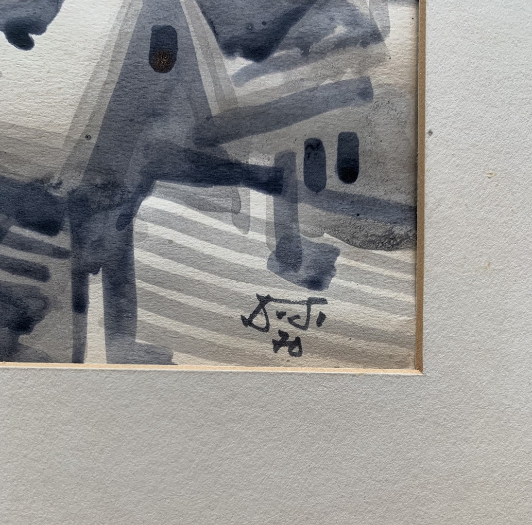 Stadtbild mit Kirche, 1973, Tusche auf Papier. Bild 39 x 27 cm, Passepartout 84 x 59 cm.