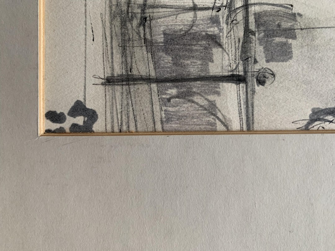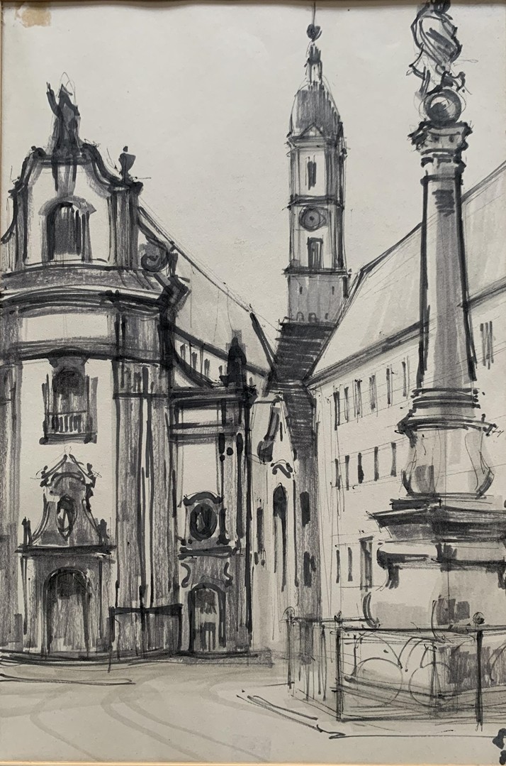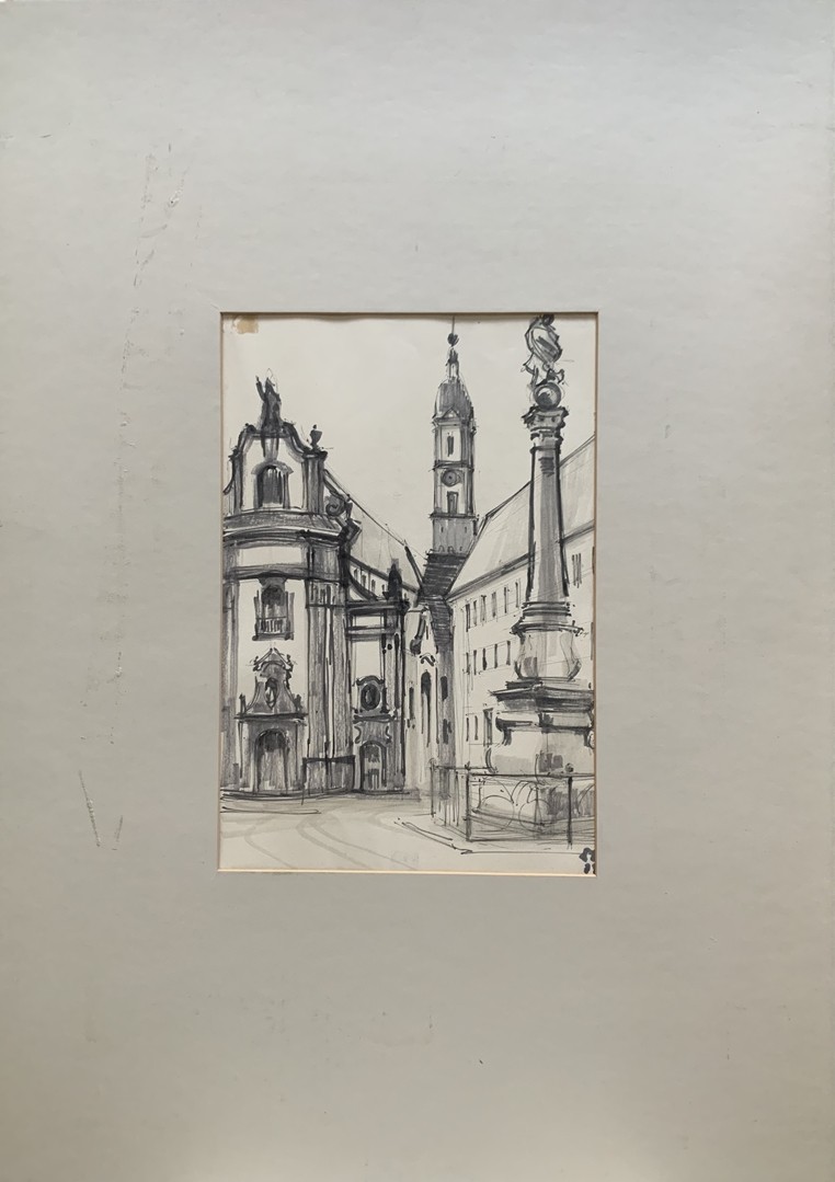 Kirchenansicht, 1968, Tusche auf Papier. Unten rechts signiert und datiert. Bild 56 x 38 cm, Passepartout 84 x 59 cm.