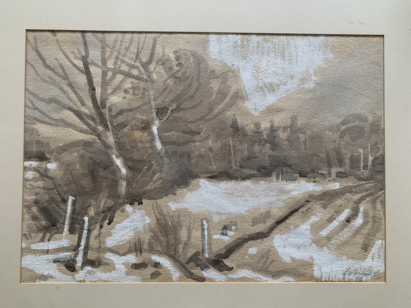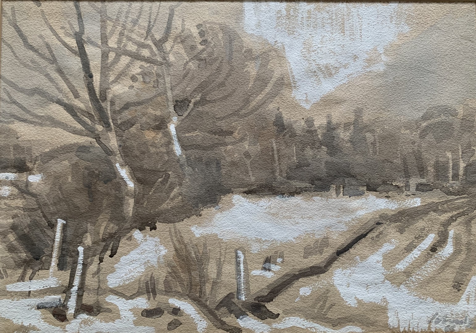 Landschaft im Schnee, 1966, Aquarell auf Papier. Unten rechts signiert und datiert. Bild 42 x 61 cm, Passepartout 61 x 85 cm.