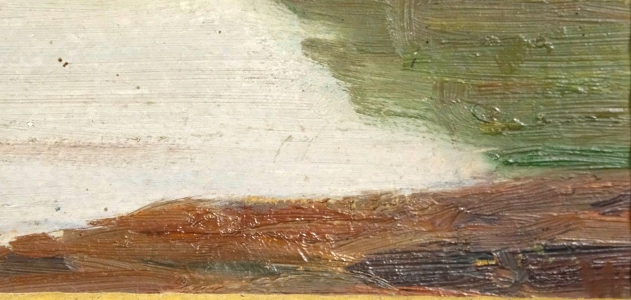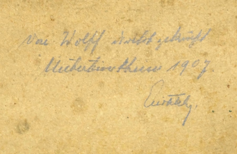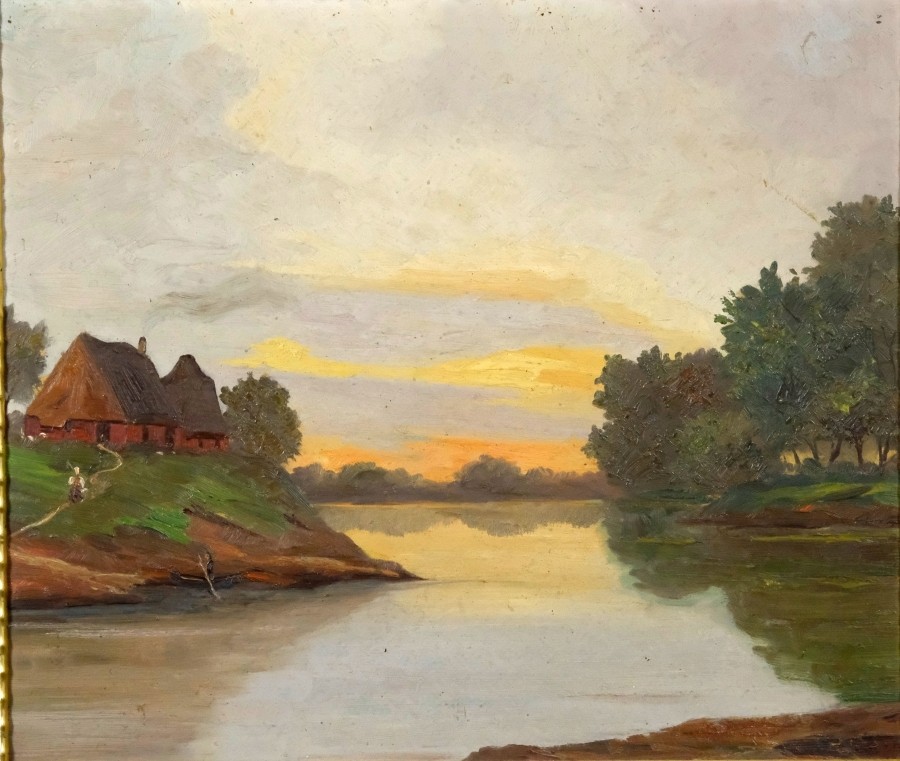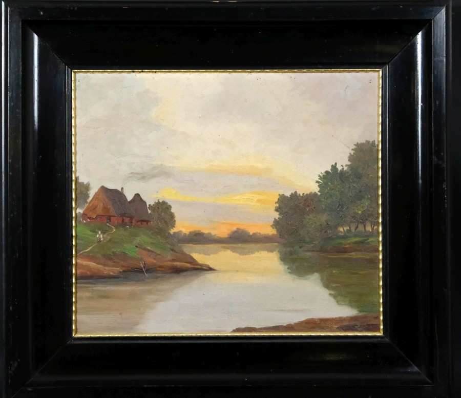 Landschaft mit einem Haus am See. Unten rechts erster Buchstabe einer Signatur sichtbar "W", Rest wird vom Rahmen verdeckt. Rückseitig bezeichnet "von Wolff direkt gekauft Untertürkheim 1907".