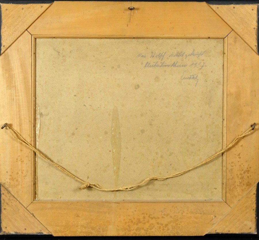 Karton 36 x 42 cm in dunklem Rahmen 50 x 57 cm.