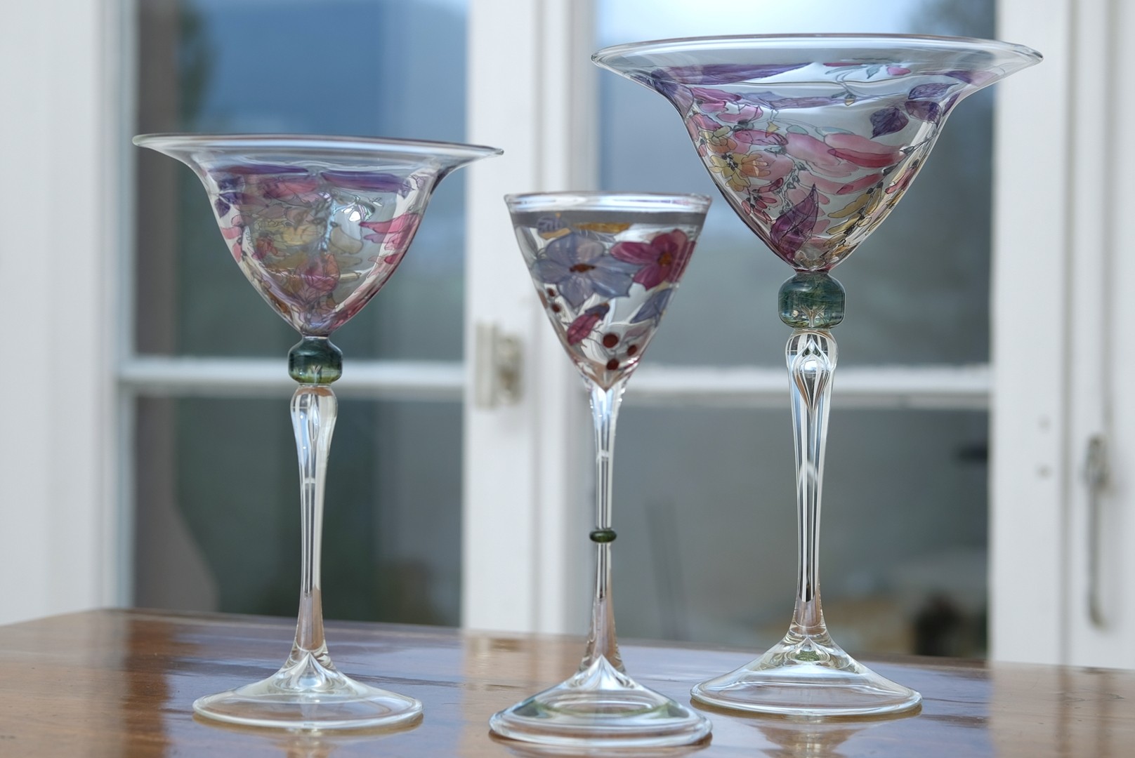 Künstlerglas Vera Walther: Drei Design-Kelche mit floralen Bemalungen.