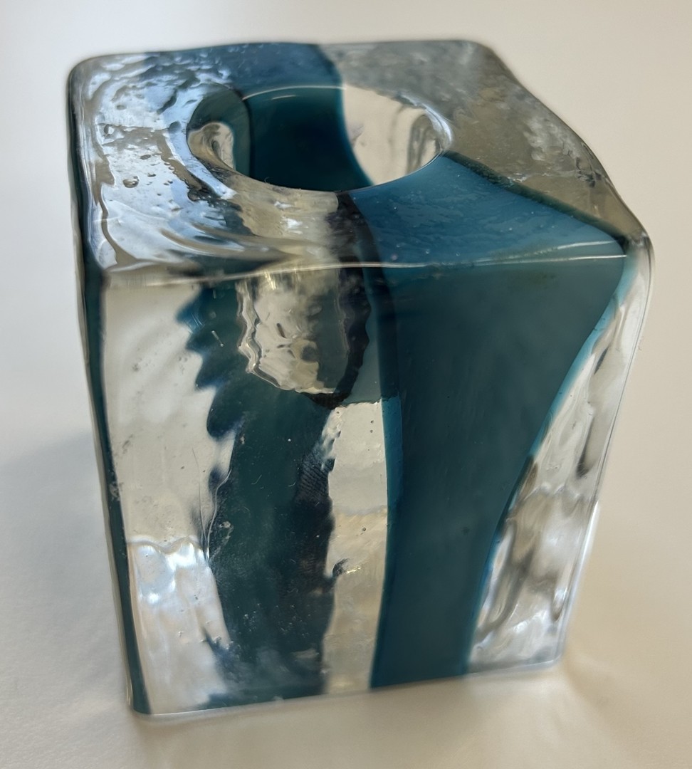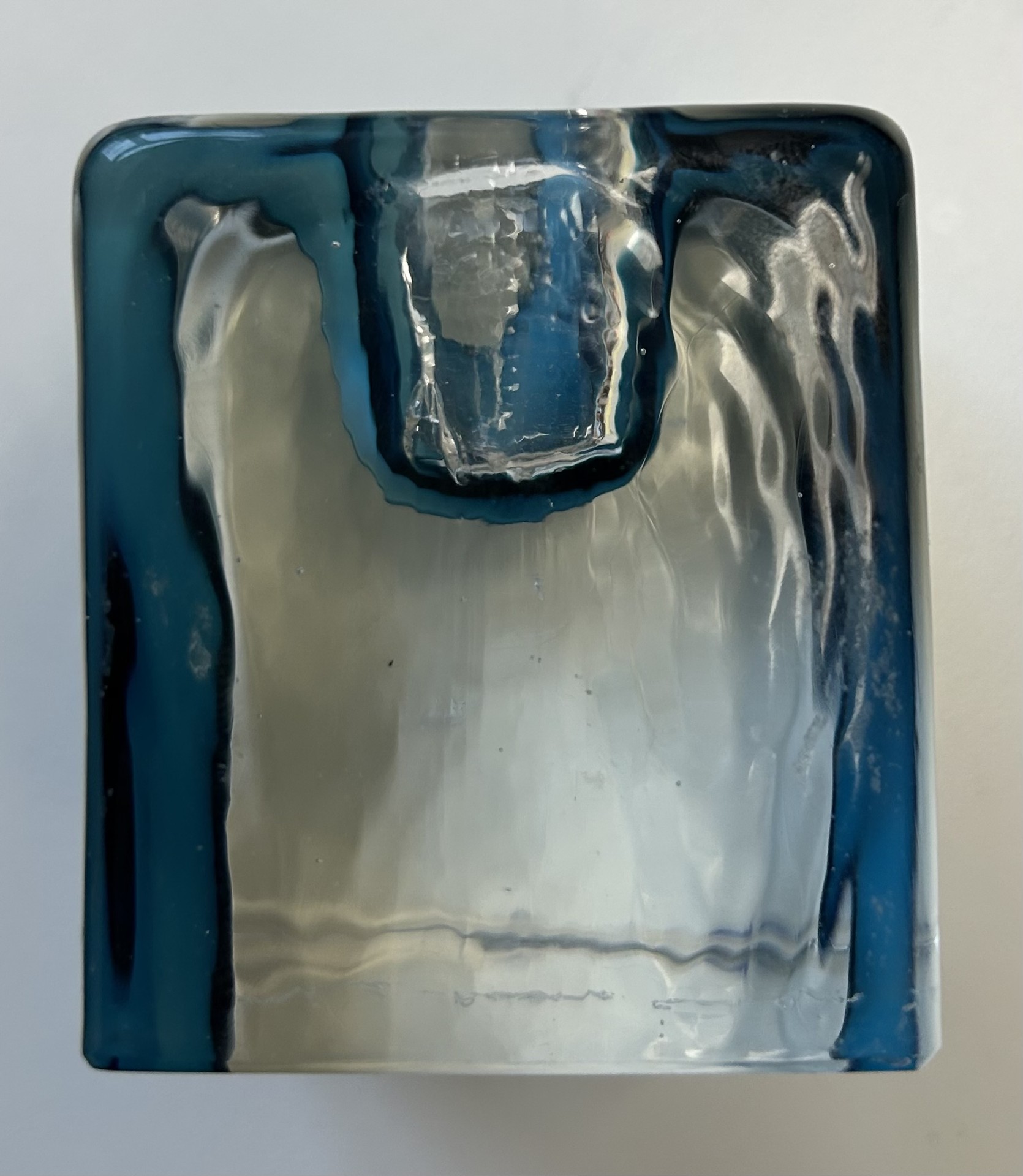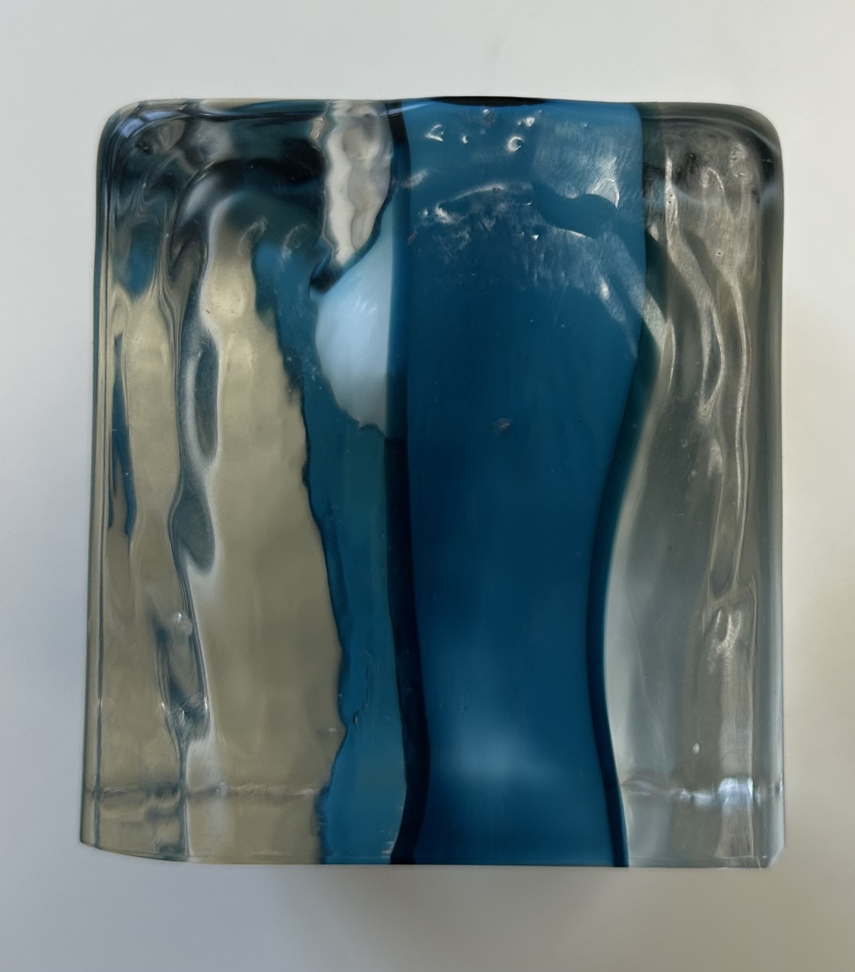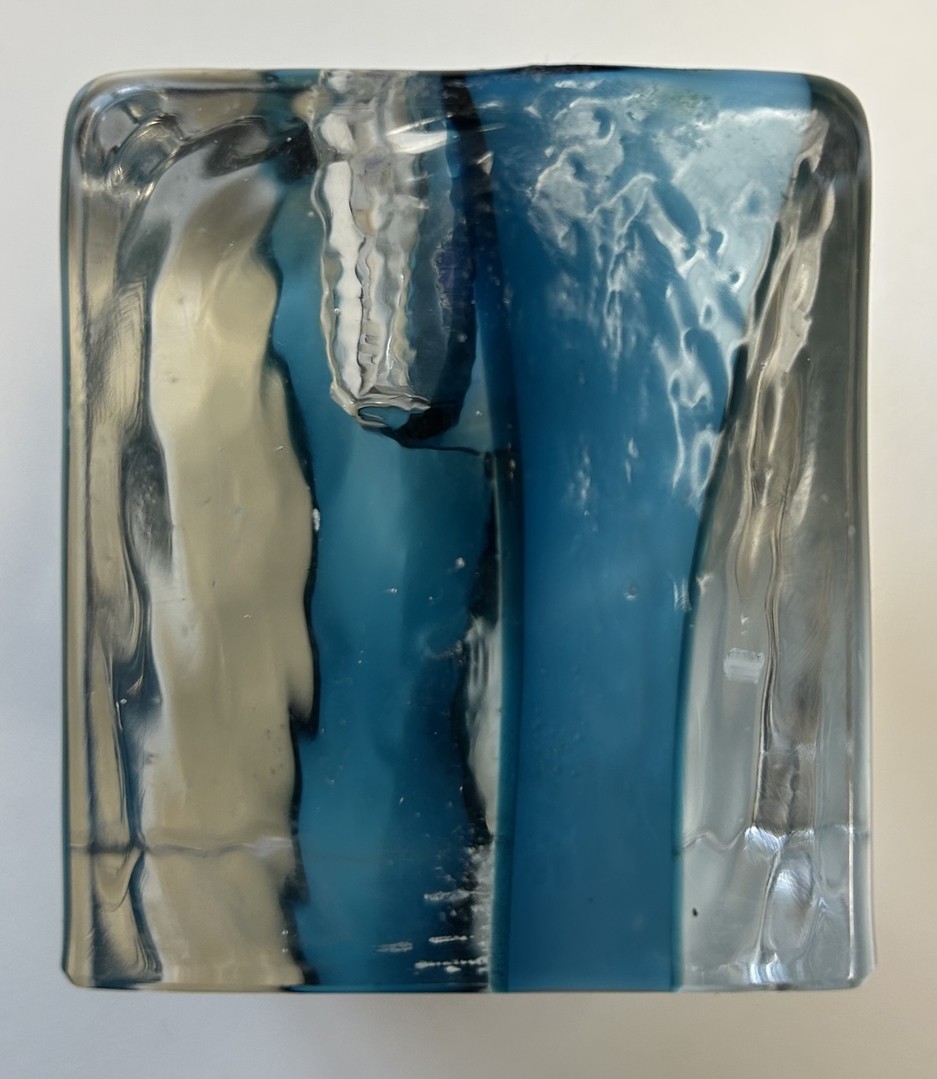 Farbloses Glas mit eingeschmolzenen Streifen in Blau, Cyan und Weiß.