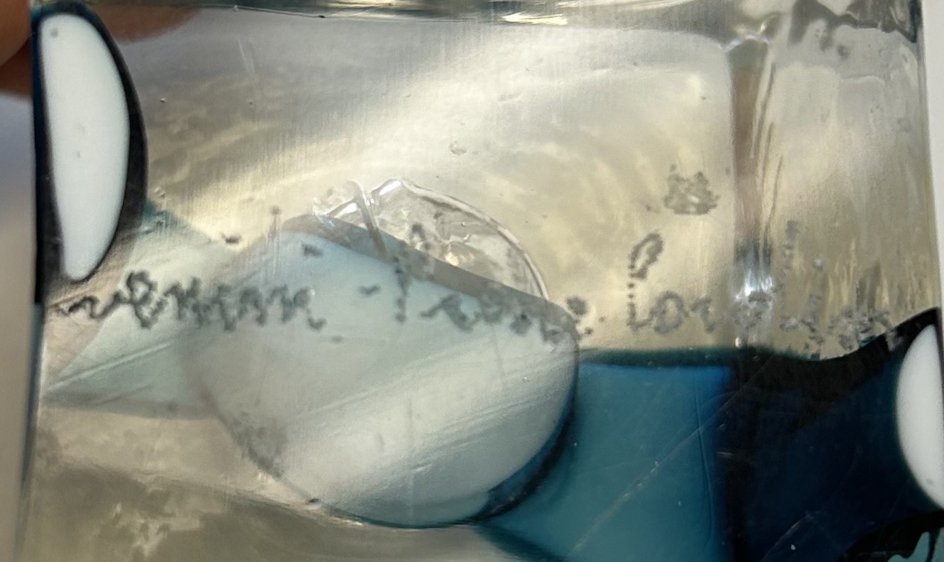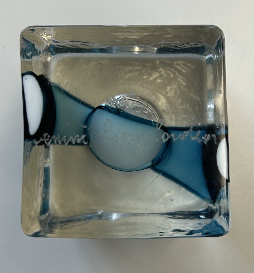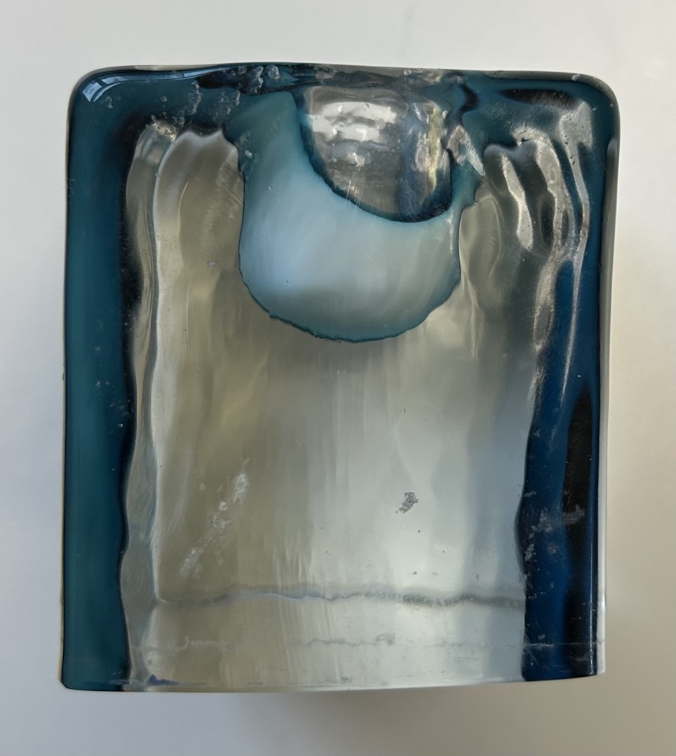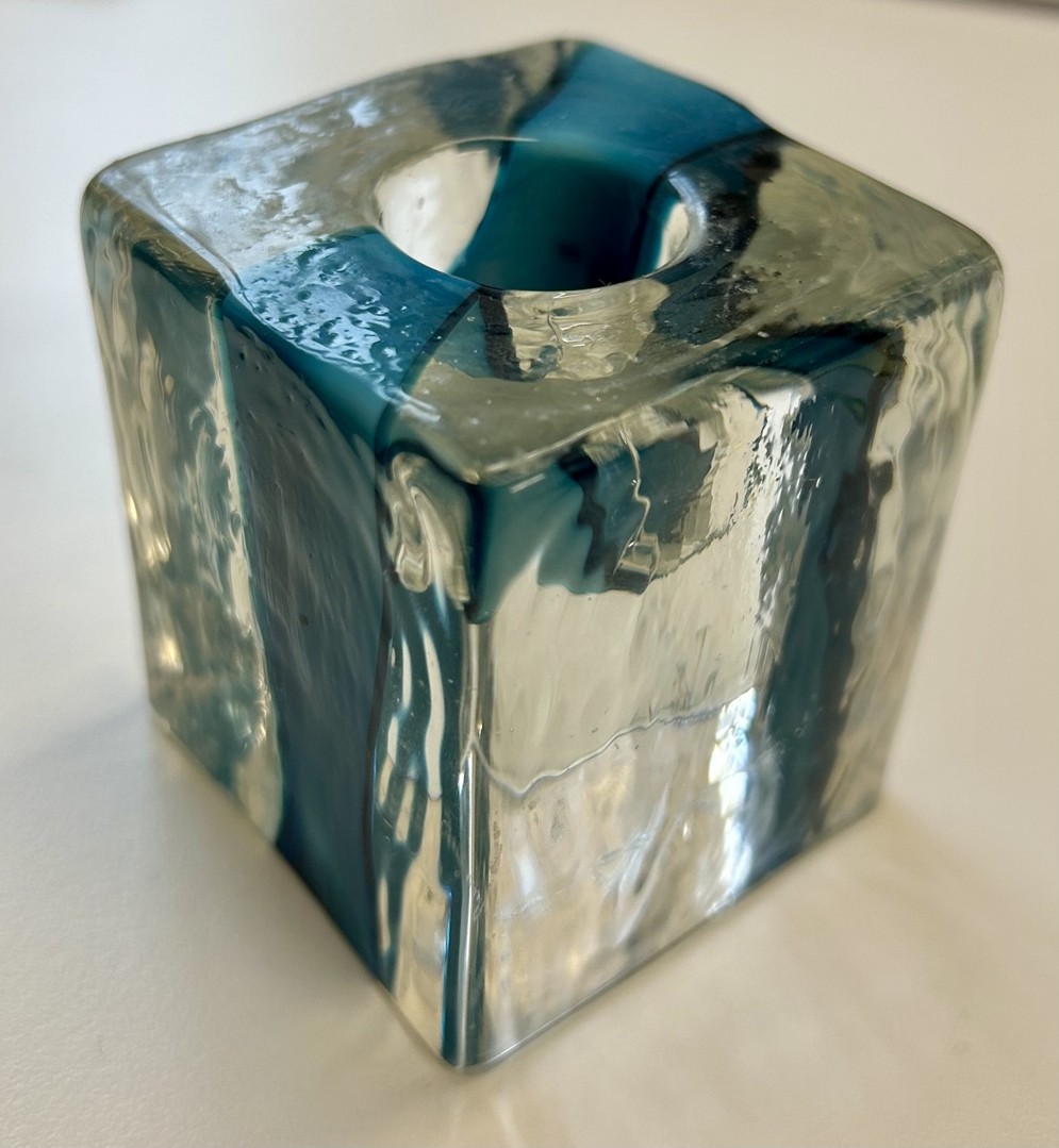 Farbloses Glas mit eingeschmolzenen Streifen in Blau, Cyan und Weiß.
