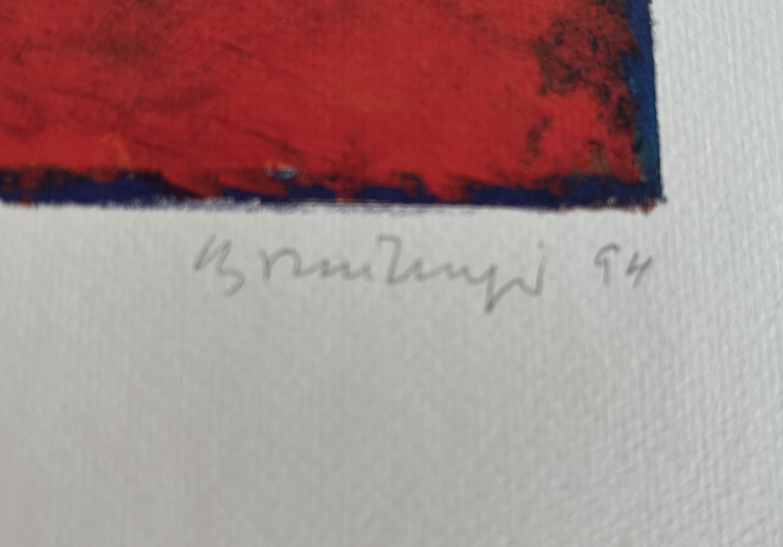 Breinlinger, Gerhard (1947 geboren) Abstrakt, farbiger Offsetdruck. Ein in rot gehaltenes Abstraktes Werk.