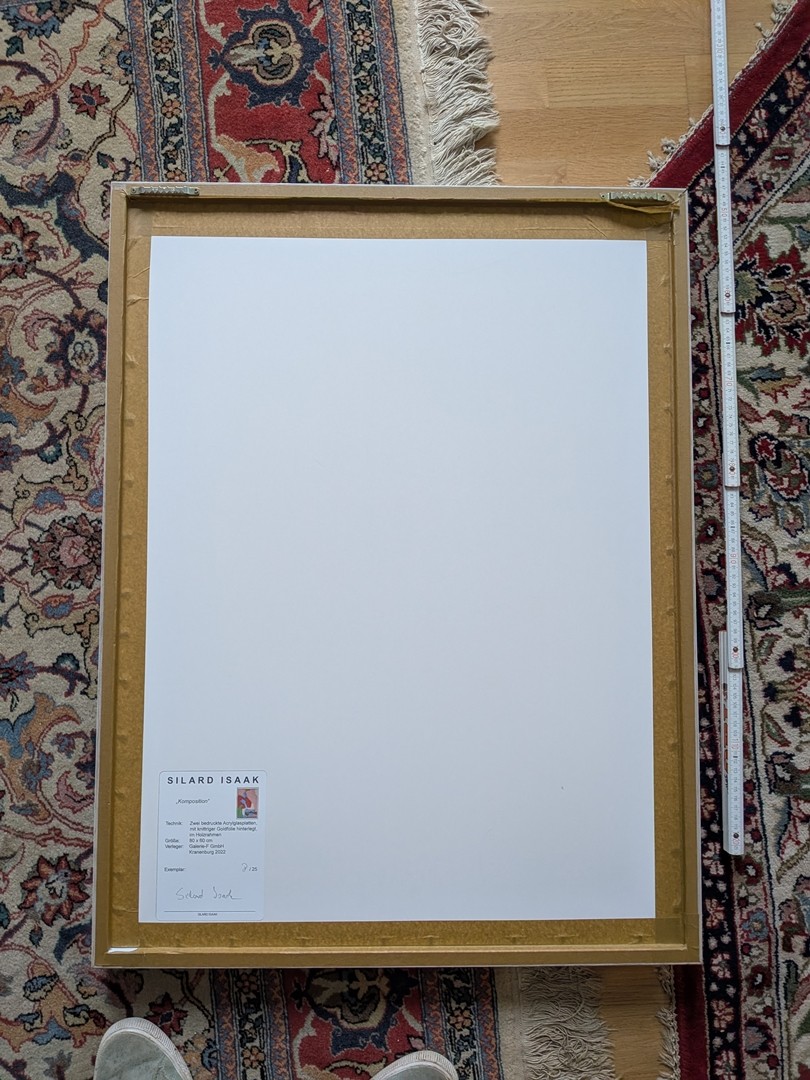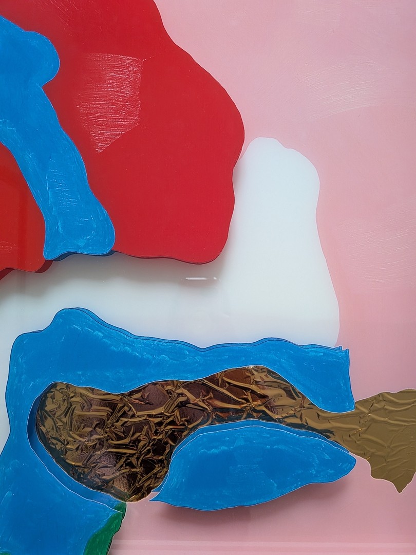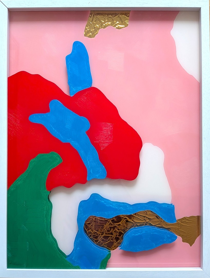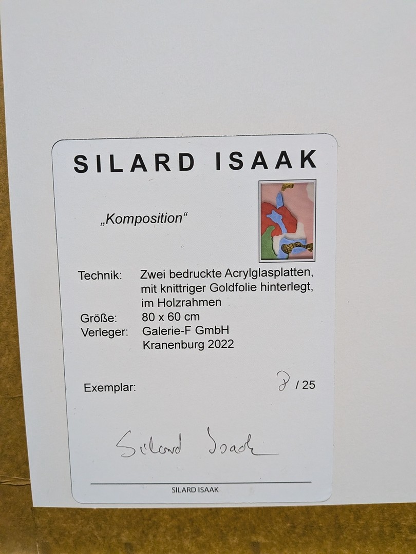 Los 413 - Isaak, Silard (geboren 1977) "Komposition", 2022, Gedrucktes Acrylglas und Goldfolie. Diese Arbeit ist ein herausragendes Beispiel für Silard Isaaks surreal-abstrakten Stil. Das Werk spielt mit lebendigen, geschichteten Formen in kräftigen Grundfarben - Rot, Blau, Grün und Weiß - die durch die spiegelnden, zerknitterten Akzente der Goldfolie Tiefe und Textur erhalten. Auflage von 25 einzigartigen Werken.