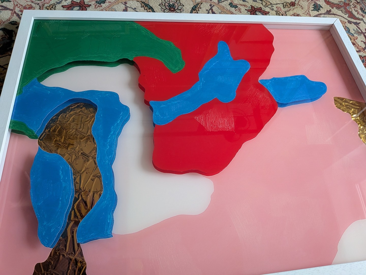 Isaak, Silard (geboren 1977) "Komposition", 2022, Gedrucktes Acrylglas und Goldfolie. Diese Arbeit ist ein herausragendes Beispiel für Silard Isaaks surreal-abstrakten Stil. Das Werk spielt mit lebendigen, geschichteten Formen in kräftigen Grundfarben - Rot, Blau, Grün und Weiß - die durch die spiegelnden, zerknitterten Akzente der Goldfolie Tiefe und Textur erhalten. Auflage von 25 einzigartigen Werken.