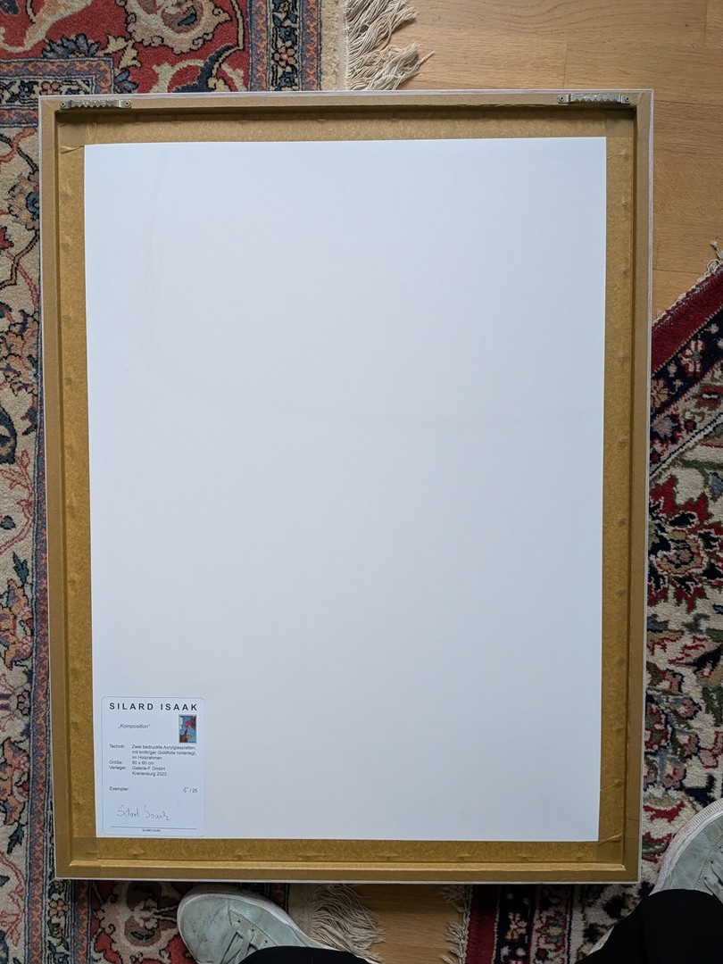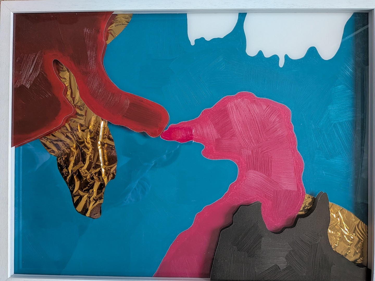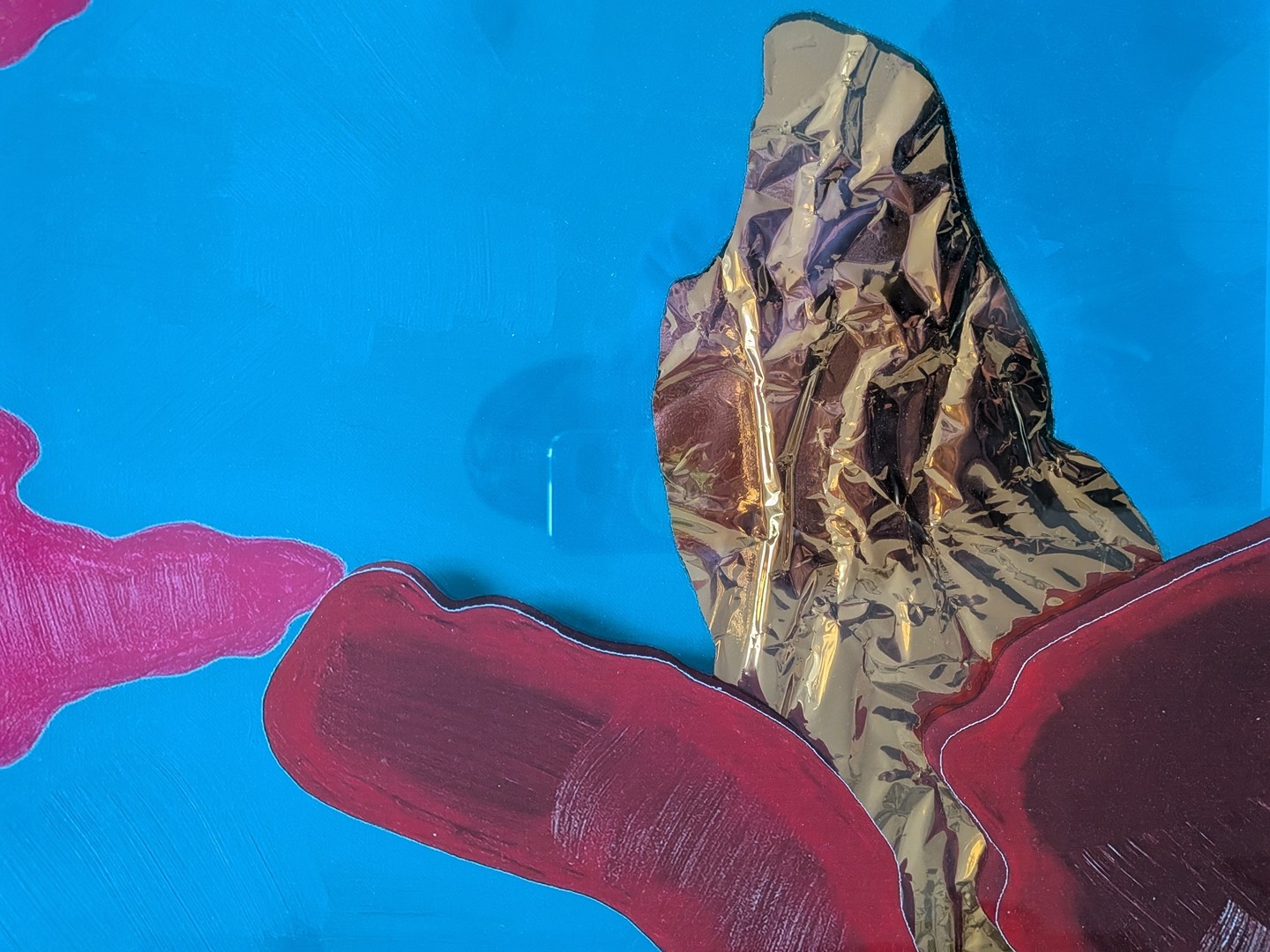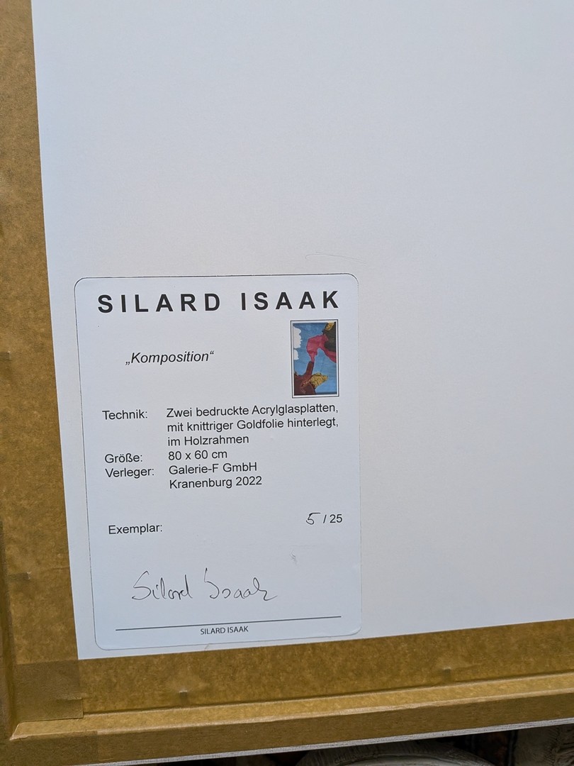 Los 414 - Isaak, Silard (geboren 1977) "Komposition", 2022, Gedrucktes Acrylglas und Goldfolie. Diese Arbeit ist ein herausragendes Beispiel für Silard Isaaks surreal-abstrakten Stil. Das Werk spielt mit lebendigen, geschichteten Formen in kräftigen Grundfarben - Rot, Blau, Pink, Schwarz und Weiß - die durch die spiegelnden, zerknitterten Akzente der Goldfolie Tiefe und Textur erhalten. Auflage von 25 einzigartigen Werken.