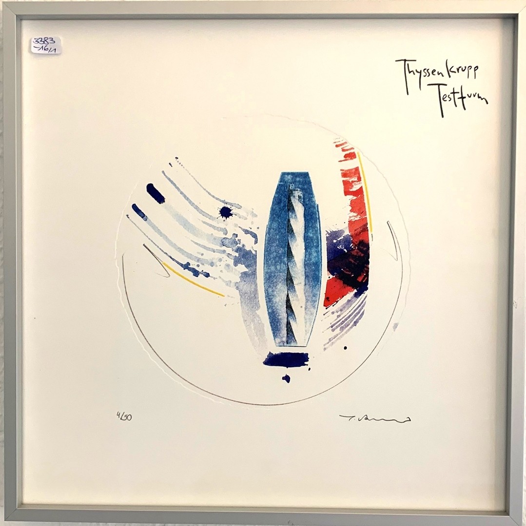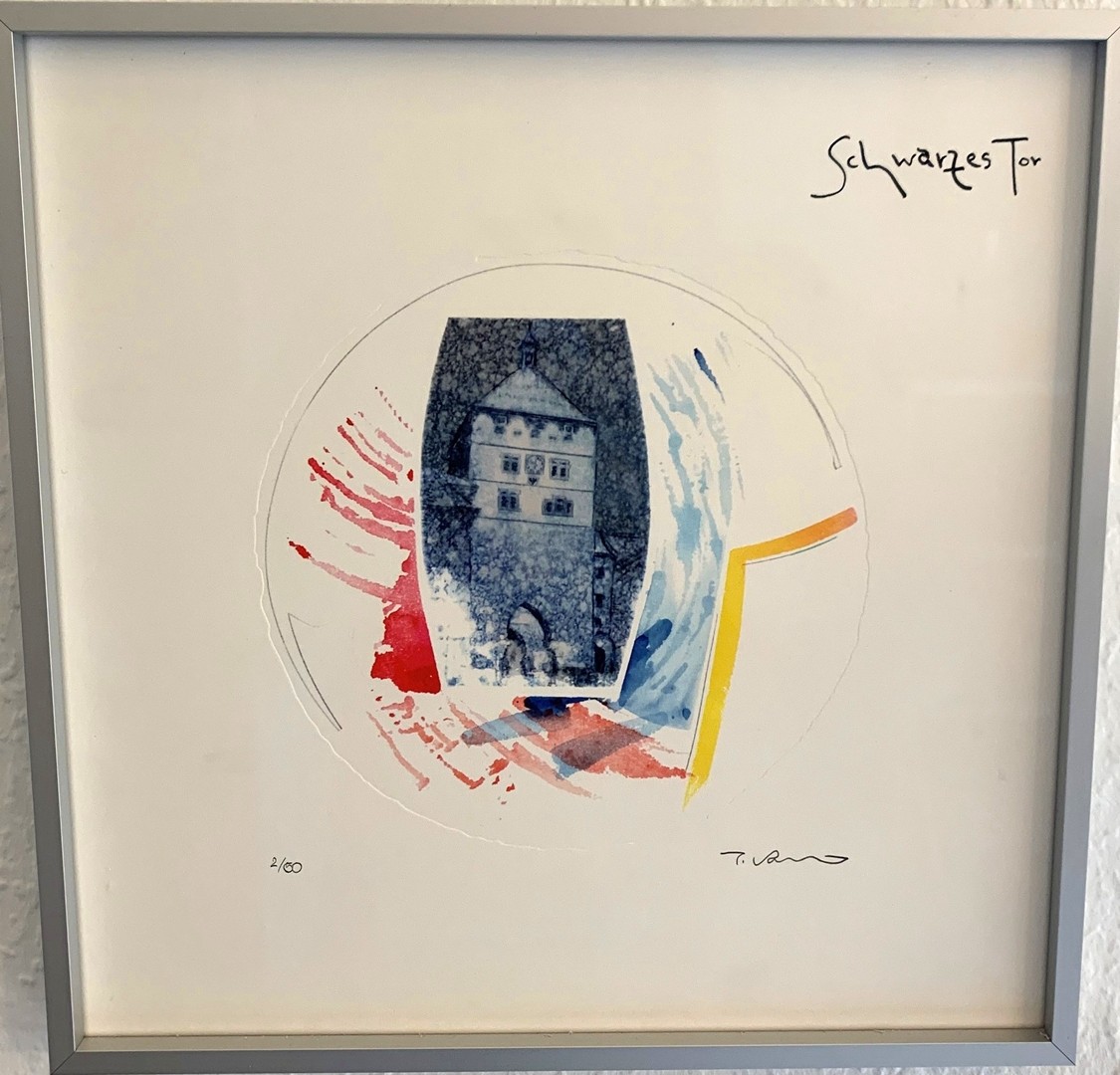 Kammerer, Tobias (1968 geboren) "Hochturm", "Thyssenkrupp Testturm", "Schwarzes Tor", Lithographie, drei Stück. Drei limitierte Lithografien von einer Serie, in der Tobias Kammerer bekannte Bauwerke aus Rottweil in einem modernen, farbintensiven Stil interpretiert. Charakteristisch ist die Kombination aus einem klar erkennbaren Bauwerk in der Mitte und dynamisch-abstrakten Farbflächen und Formen drumherum.