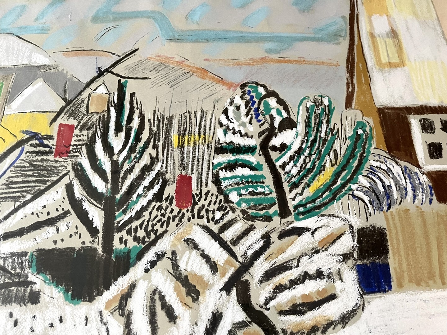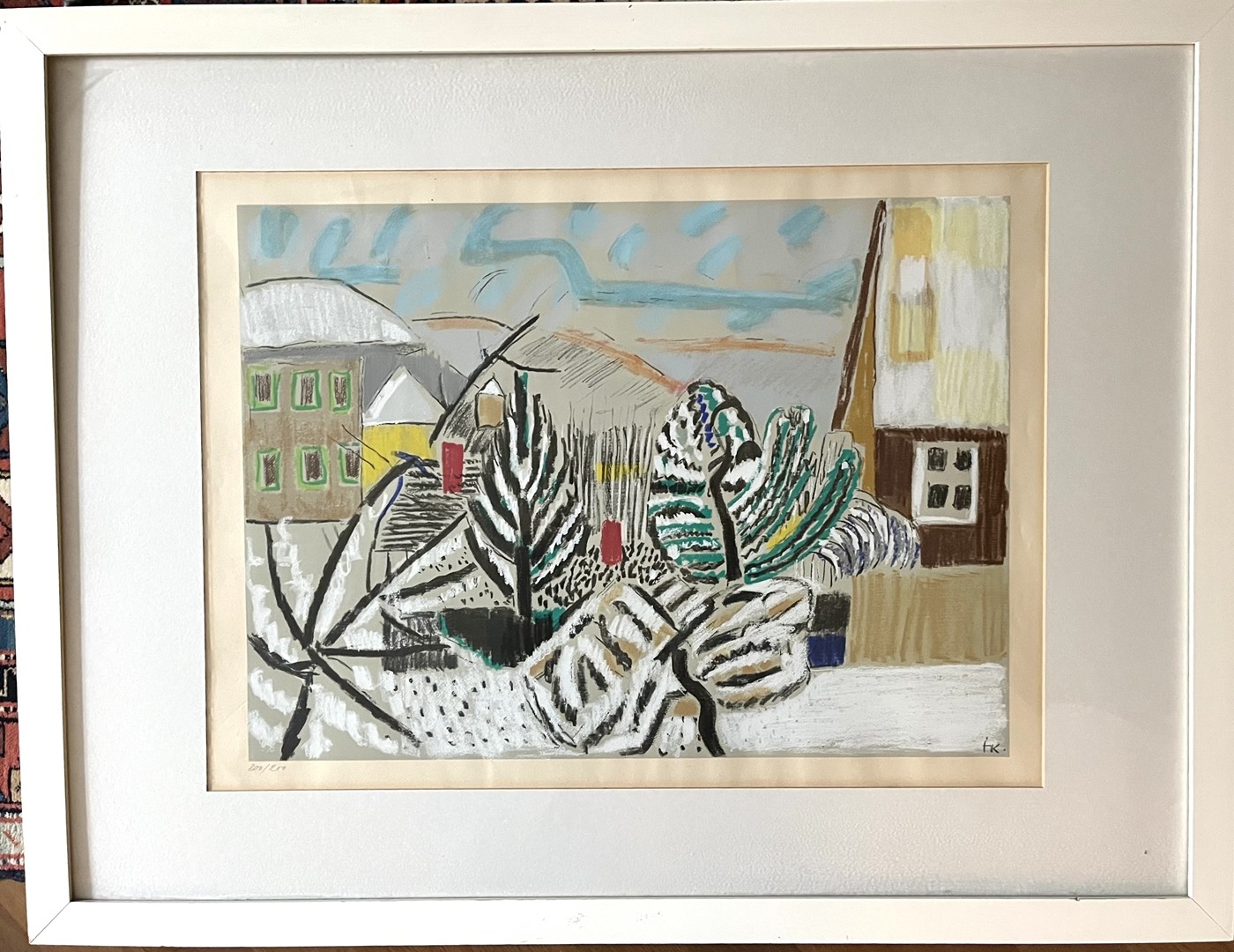 Kerkovius, Ida (1879-1970) Winterlandschaft, Farbserigraphie. Bunte Winterlandschaft mit Häusern im Hintergrund.