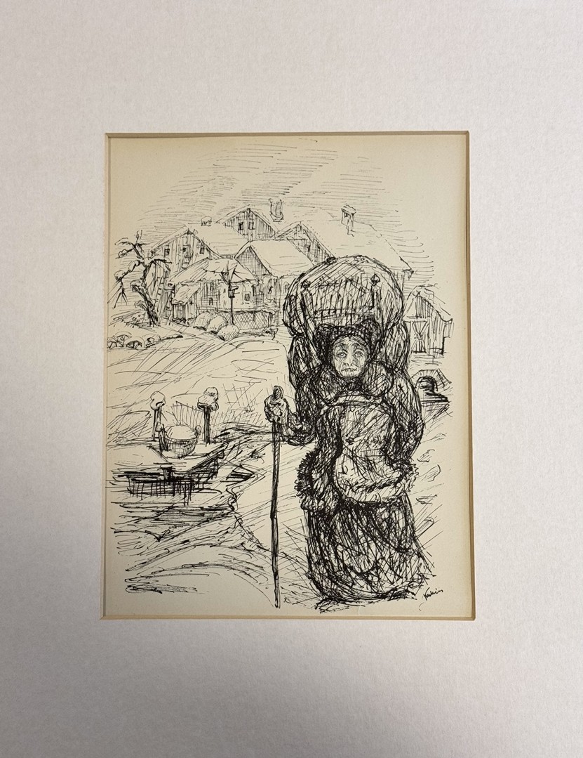 Alte Frau, die mit ihrem Hab und Gut auf der Reise ist. Im Hintergrund eine Stadt, Blatt 26 x 19 cm, im Passepartout 40 x 30 cm. Sowie die Bremer Stadtmusikanten zu Tisch, Blatt 24 x 20 cm.