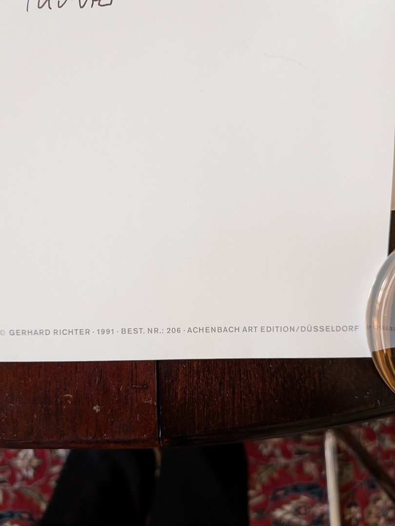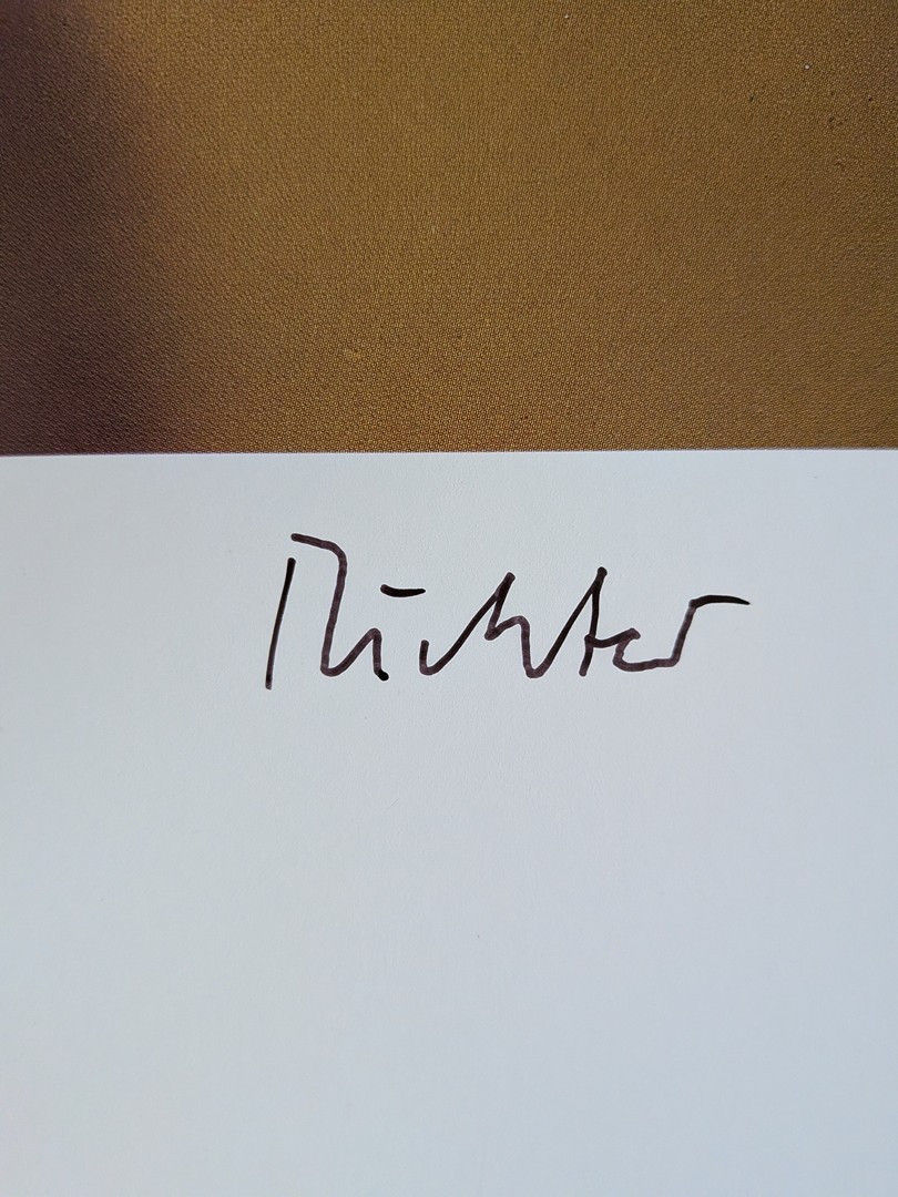 Los 441 - Richter, Gerhard (1932 geboren) "Abstraktes Bild 1977" 1991, handsignierter Farboffsetdruck. Der Druck stellt eines Richters "Abstrakten Bilder" Ölgemälde von 1977 dar - ein zentrales Thema in Richters Werk. Die abstrakten Bilder sind eine komplexe Mischung aus Kontrolle und Zufall. Er beginnt oft ohne ein vorgegebenes Motiv und arbeitet sich Schicht für Schicht vor, bis das Bild für ihn erkennbar ist. Unten mit Texteindruck: "Gerhard Richter, Collection of Contemporary Art" und "Gerhard