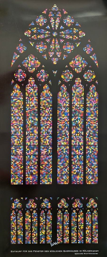 Richter, Gerhard (1932 geboren) Entwurf für das Fenster des südlichen Querhauses im Kölner Dom, 2007, handsignierter Farboffsetdruck. Das Bild zeigt den Entwurf für das Richter-Fenster im Kölner Dom. Es handelt sich um ein 106 Quadratmeter großes Buntglasfenster im südlichen Querhaus, das 2007 vom Künstler Gerhard Richter entworfen wurde. Das Fenster besteht aus 11.263 Glasquadraten in 72 verschiedenen Farben. Die Anordnung der Quadrate wurde größtenteils zufällig mit einem Computerprogramm generiert, wobei Richter die Farbauswahl aus seinen eigenen Werken ableitete.