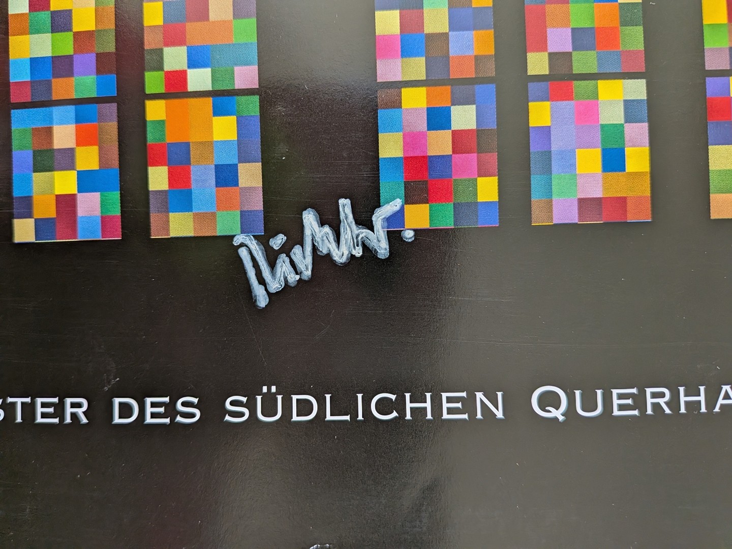 Los 440 - Richter, Gerhard (1932 geboren) Entwurf für das Fenster des südlichen Querhauses im Kölner Dom, 2007, handsignierter Farboffsetdruck. Das Bild zeigt den Entwurf für das Richter-Fenster im Kölner Dom. Es handelt sich um ein 106 Quadratmeter großes Buntglasfenster im südlichen Querhaus, das 2007 vom Künstler Gerhard Richter entworfen wurde. Das Fenster besteht aus 11.263 Glasquadraten in 72 verschiedenen Farben. Die Anordnung der Quadrate wurde größtenteils zufällig mit einem Compute