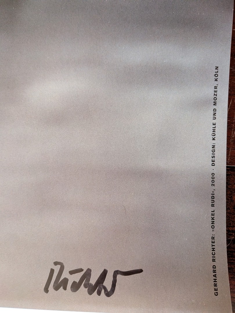 Richter, Gerhard (1932 geboren) "Onkel Rudi" 2000, handsignierter Farboffsetdruck. Der Druck ist nach einem Ölgemälde mit dem Titel "Onkel Rudi" von 1965 gemacht. Das Werk wurde auf einem Foto von Richters Onkel Rudi, einem Wehrmachtssoldaten, basiert. Richter malte das Bild nach dem Tod seines Onkels im Zweiten Weltkrieg. Das Gemälde ist ein Beispiel für Richters fotorealistischen Stil, bei dem er Fotos als Vorlage für seine Werke verwendet. Herausgeber: Kühle und Mozer / Köln.