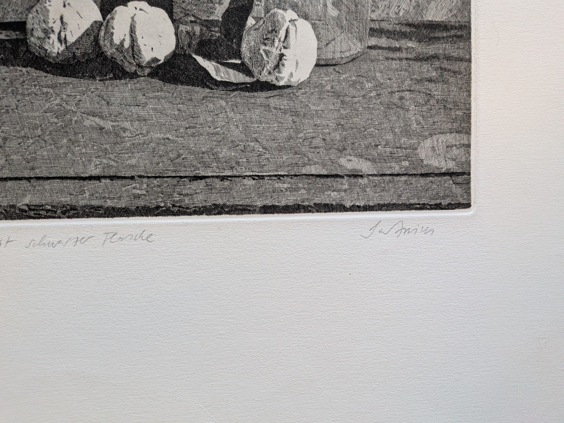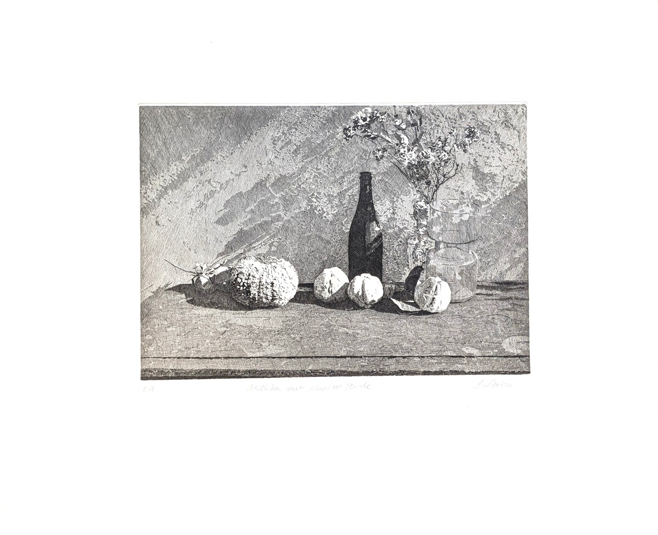 Sartorius, Malte (1933-2017) "Stillleben mit schwarzer Flasche" 20. Jahrhundert, Radierung. Ein schönes Stillleben, das mit feiner Strichführung und präziser Lichtgestaltung ausgeführt ist.