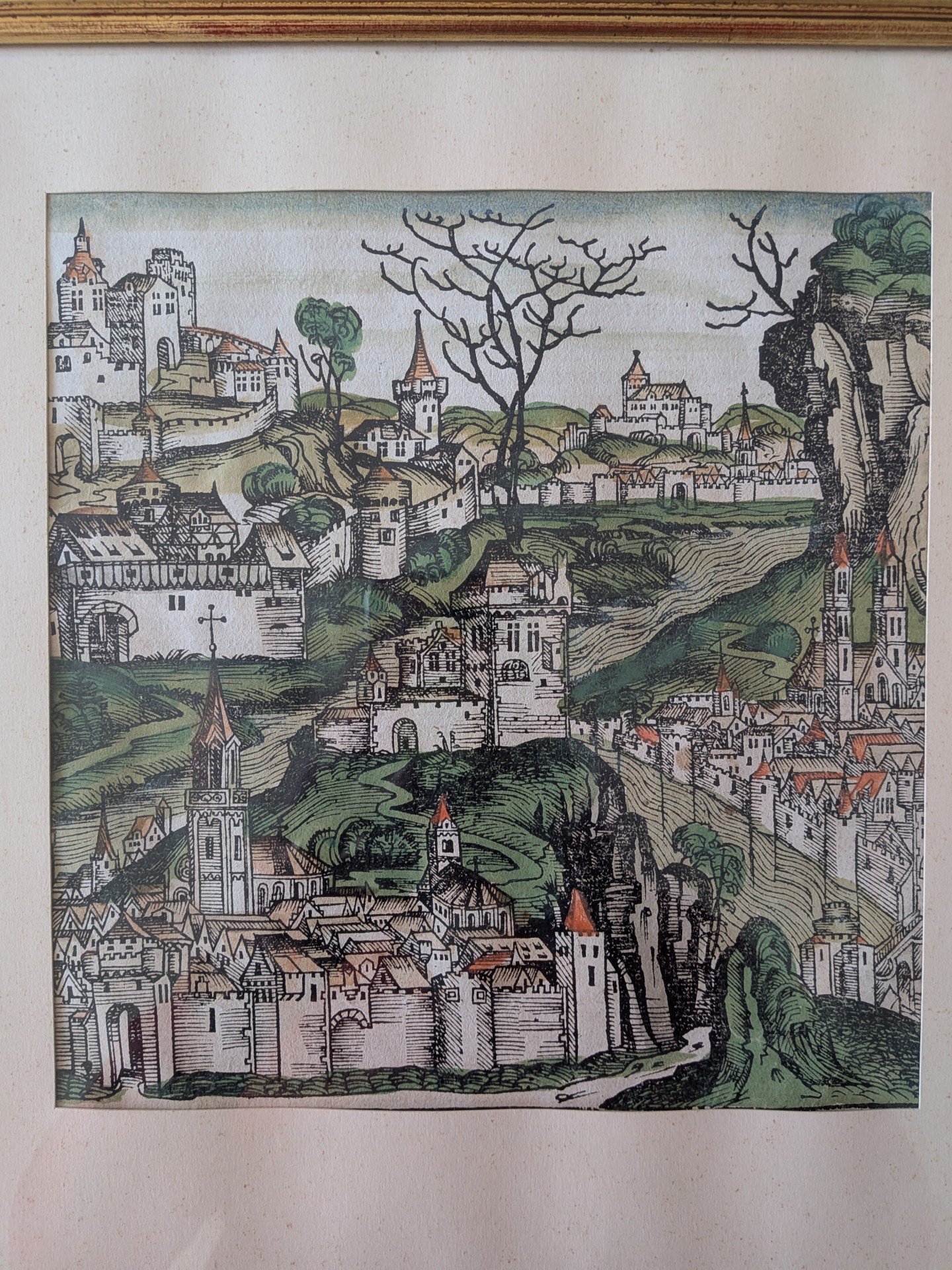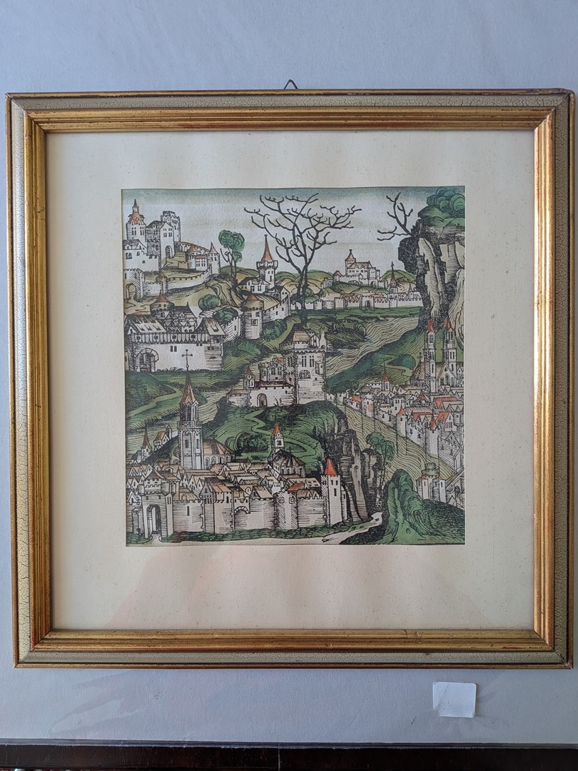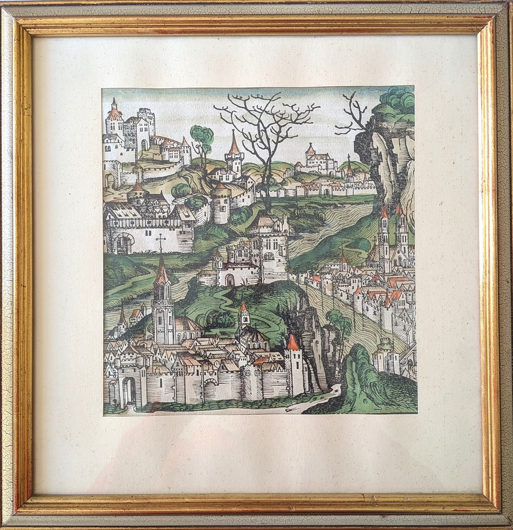 Los 450 - Schedel, Hartmann (1440-1514) "Schedelschen Weltchronik", 1493, kolorierter Holzschnitt auf Papier. Der kolorierte Holzschnitt stammt aus der Schedelschen Weltchronik (Nürnberg 1493), einem der bedeutendsten Inkunabelwerke der frühen Buchdruckkunst. Die Darstellung zeigt eine idealisierte Stadtansicht, wie sie für die Chronik typisch ist: eine detailreiche, dicht bebaute mittelalterliche Metropole mit Mauern, Toranlagen, Türmen und charakteristischen roten Dächern. Mit vergoldetem Rahmen.