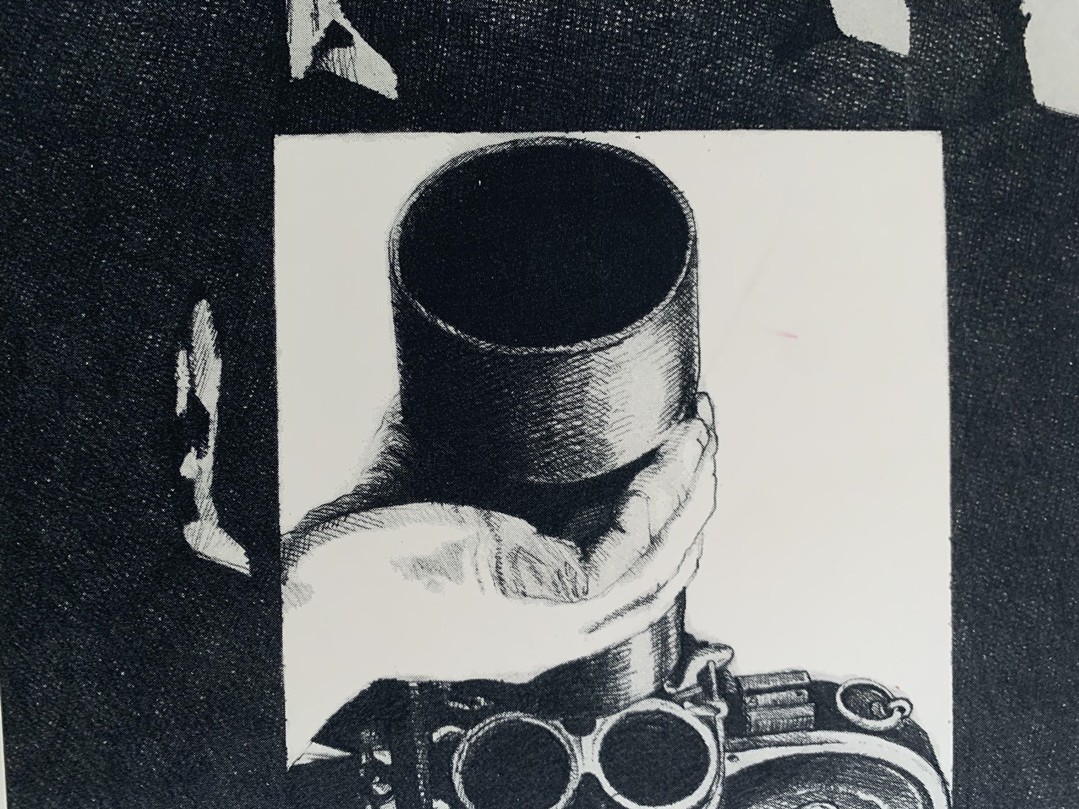 Das ist eine Collage aus verschiedenen Elementen, die ineinander verschachtelt sind: Links eine Nahaufnahme eines menschlichen Körpers, der mit einem Pinsel bearbeitet wird; in der Mitte eine Gruppe von Menschen, die sich in einer unbestimmten Umgebung bewegen; Rechts: Eine Hand, die eine Kamera hält, die auf den Körper gerichtet ist. In "V. Voyeur" wird der Betrachter selbst zum Voyeur gemacht, der in die intimen Bereiche anderer Menschen eindringt.