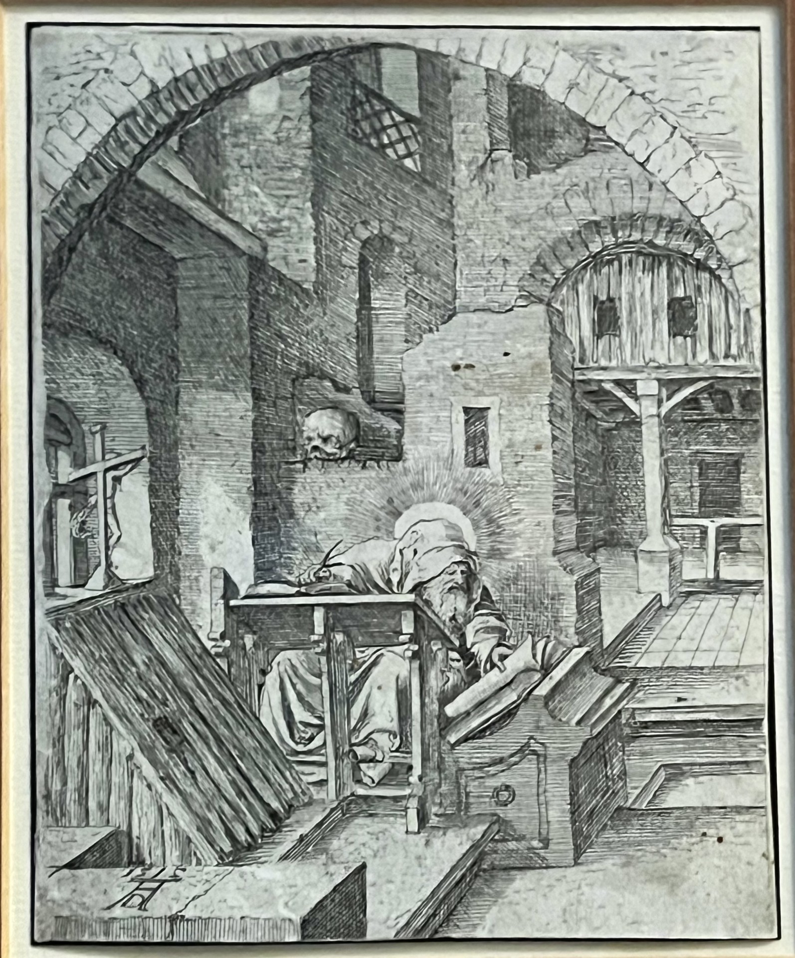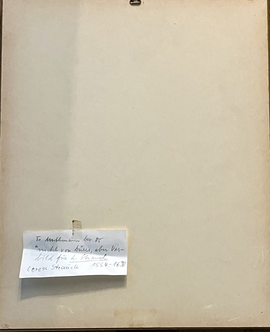 Strauch, Lorenz (1554-1630) Der Heilige Hieronymus in seinem Zuhause, Radierung auf Karton aufgezogen. Links unten Signatur und Datierung von Albrecht Dürer, rückseitig beschrieben, dass es sich um keine Radierung Dürers handelt.