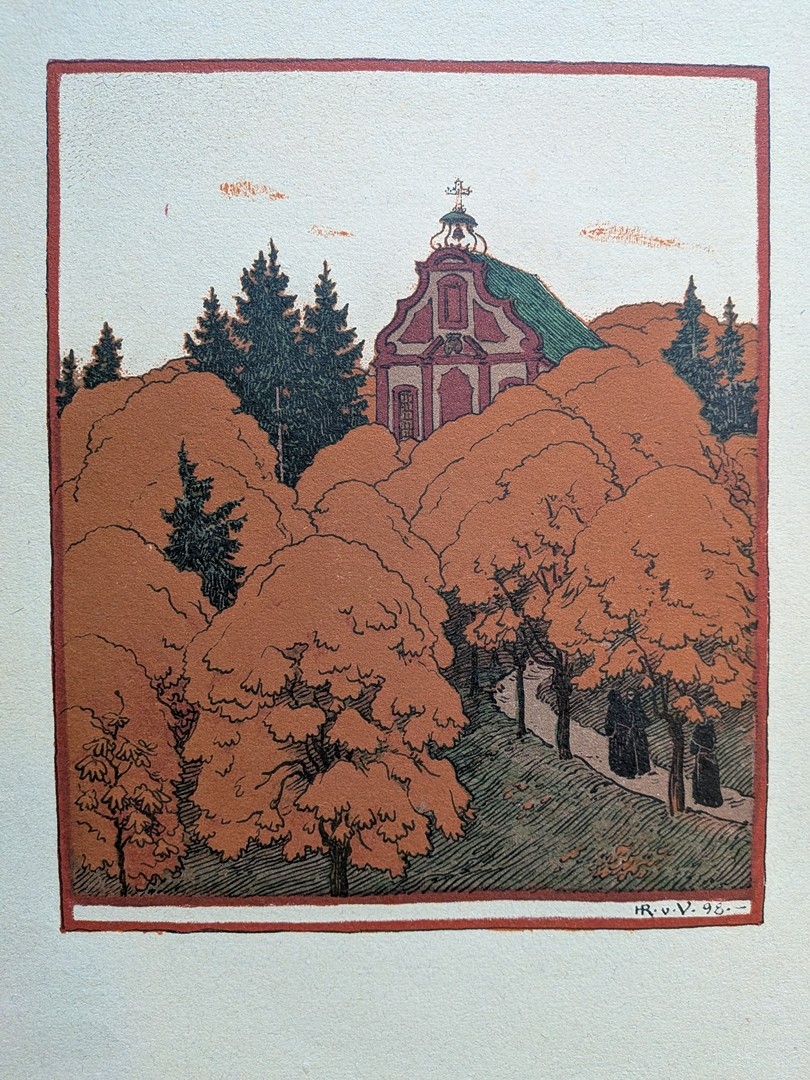 Von Volkmann, Hans (1860-1972) "Kapelle" ,1898, Farblithographie. Diese fein ausgeführte Farblithographie zeigt eine malerische Ansicht einer Kapelle, teils von dichtem, herbstlich gefärbtem Laub verdeckt. Der Weg, gesäumt von Bäumen, führt den Blick des Betrachters in das Bild hinein, wo sich die barocke Fassade der Kapelle aus der Natur erhebt. Hans von Volkmann, der dem Umkreis der Worpsweder Künstler und der Düsseldorfer Schule zugerechnet wird, verbindet hier stimmungsvolle Landschaftsgestaltung mit architektonischer Präzision.