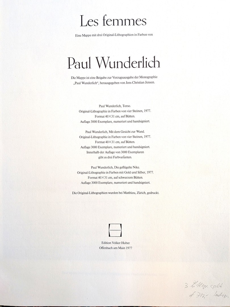 Los 474 - Wunderlich, Paul (1927-2010) "Les Femmes", 1977, Mappe und drei Lithographien. Eine Mappe mit drei Original-Lithographien in Farben von Paul Wunderlich. Die Mappe ist eine Beigabe zur Vorzugsausgabe der Monographie "Paul Wunderlich", herausgegeben von Jens Christian Jensen. Edition Volker Huber. Die Lithographien sind jeweils rechts unten signiert und links unten nummeriert. Auflage von 3000.