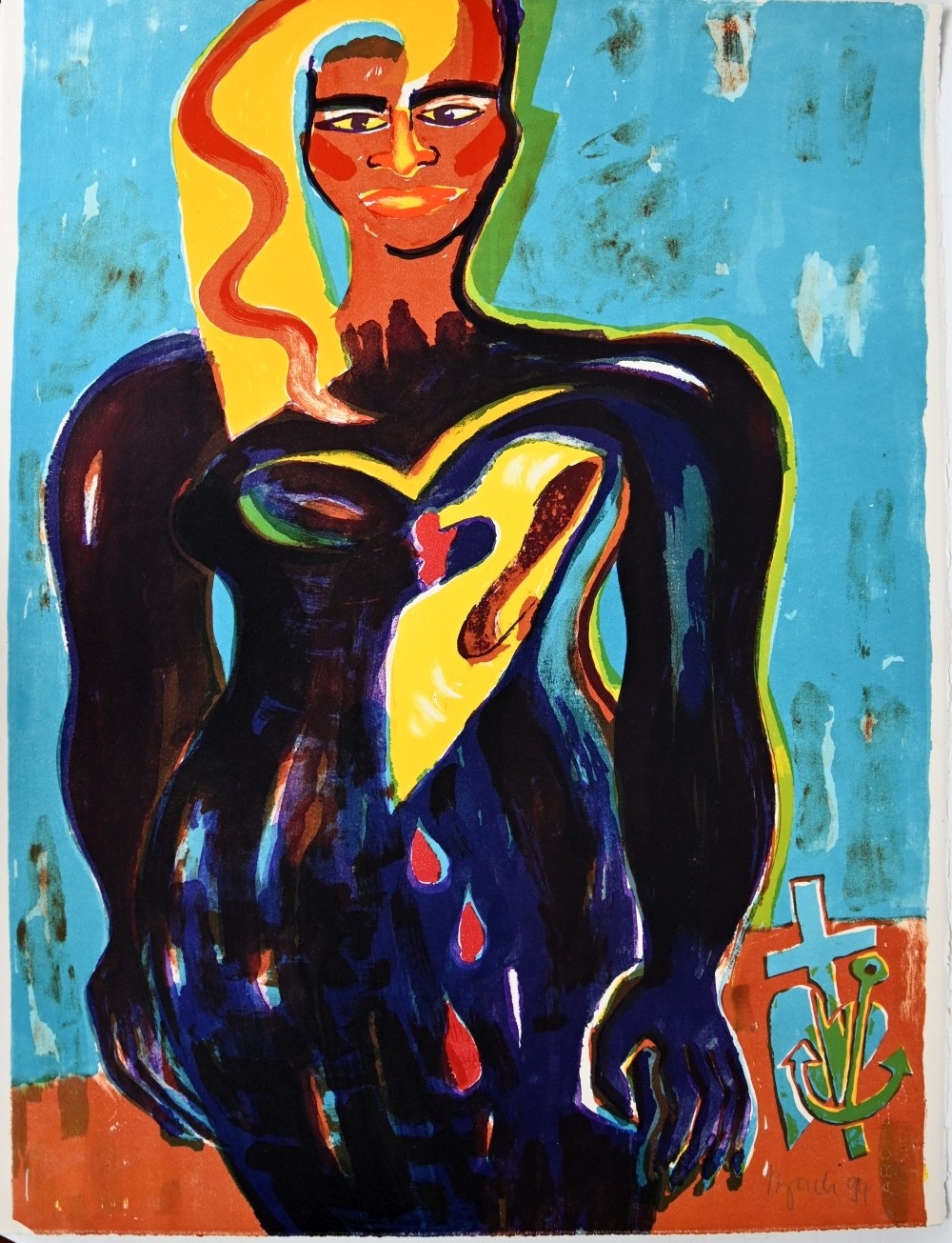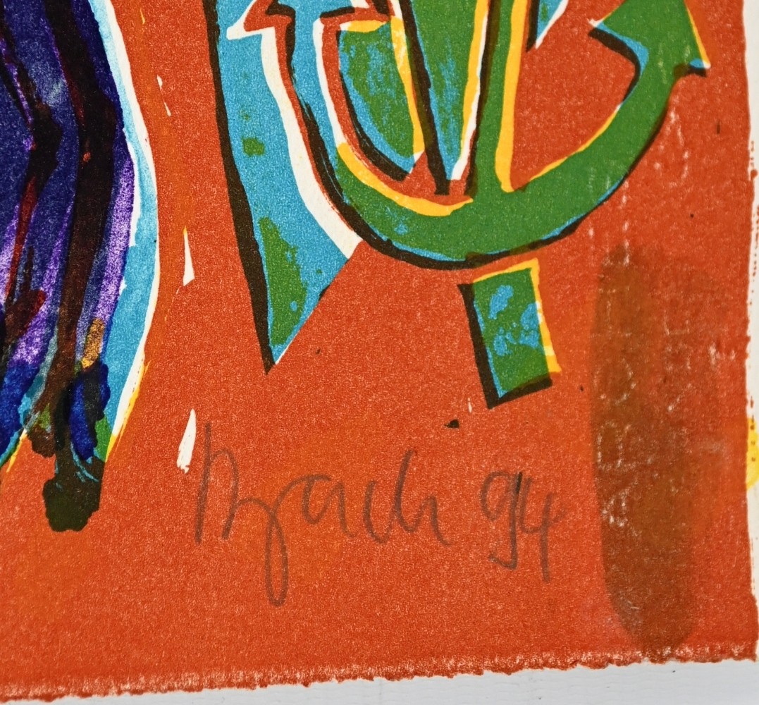 BACH Elvira (1951 Neuenhain) ''Glaube, Liebe, Hoffnung'', Frau vor Hintergrund in Türkis, Farblithographie, rechts unten signiert und (19)94 datiert, H.C., rückseitig Künstler-Stempel, 76x56cm *Bach studierte an der Staatlichen Glasfachschule in Hadamar sowie an der Hochschule der Künste Berlin. 1982 wurde sie zur documenta 7 in Kassel eingeladen - dies war ihr Durchbruch, nationale und internationale Ausstellungen folgten. Ihre Werke sind in öffentlichen Sammlungen und Museen zu finden. Neben der Malerei arbeitet Bach an Bronzeskulpturen, Keramiken und Muranoglas-Plastiken.*