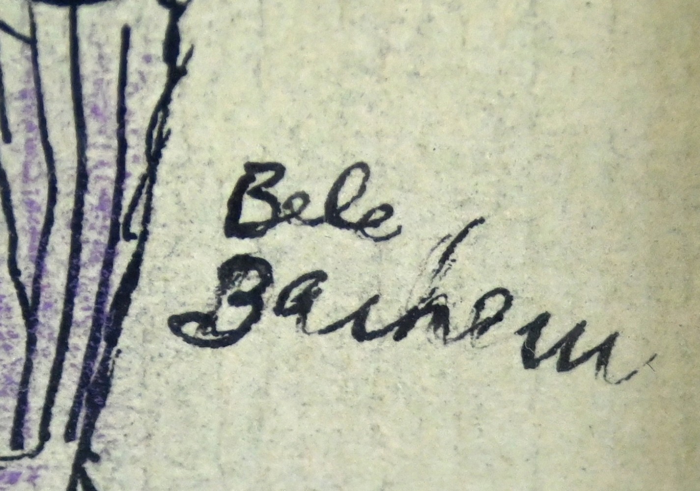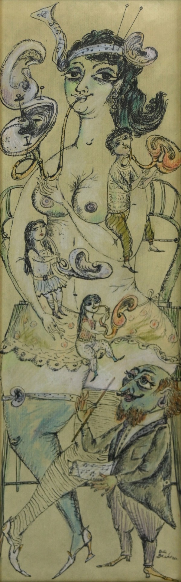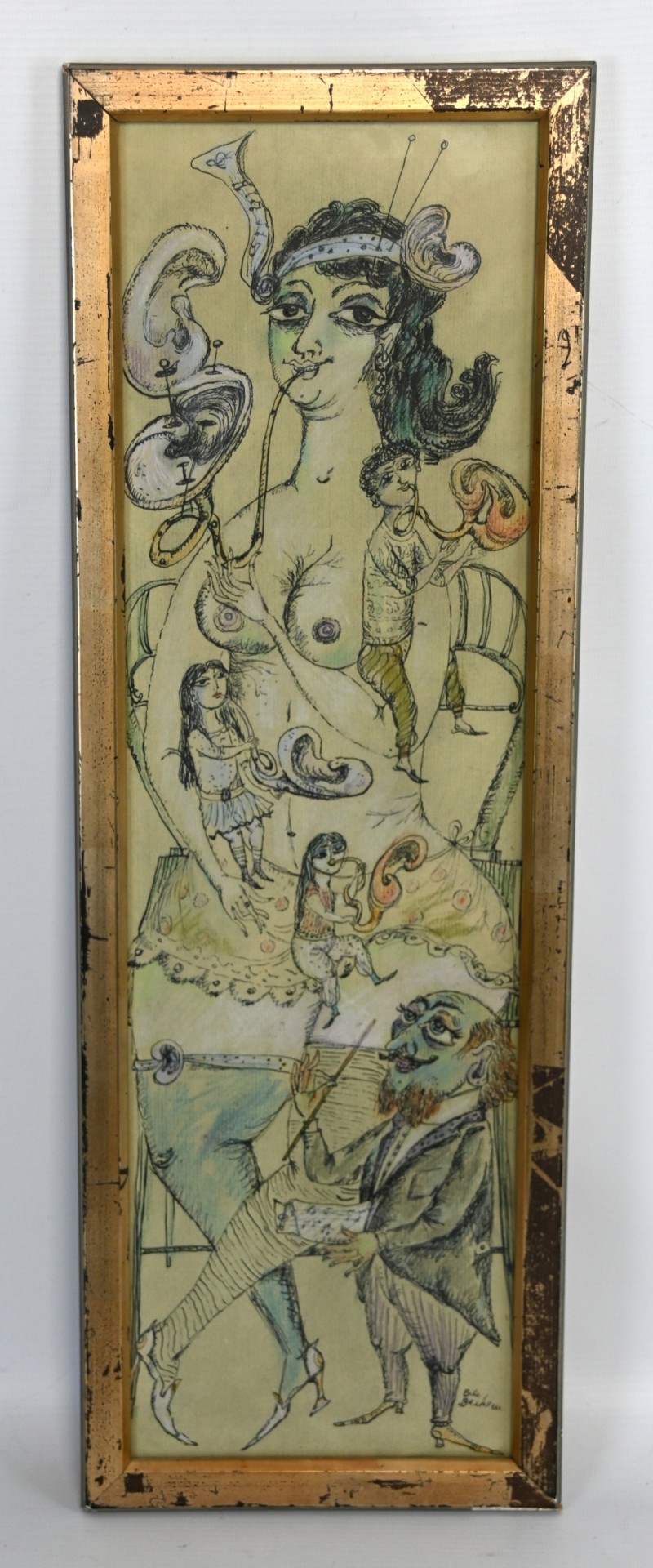 BACHEM Bele, eigentlich BACHEM Renate Gabriele (1916 Düsseldorf - 2005 München) ''Gehörbegabte Familie'', besonderes Familienportrait von Mutter, Vater und drei Kindern, alle jeweils mit einem Musikinstrument in der Hand, welches sich zu einem Ohr formt, Vater unten rechts dirigiert das Familien-Orchester, Farblithographie, teilweise von Hand mit Pastellkreide koloriert, unten rechts in der Platte signiert, 56x19cm (Rahmen), rückseitig betitelt und signiert, R *Bachem ging Ende der 1920er Jahre nach Berlin an die Kunstakademie, wo sie unter anderem von Ludwig Bartning und Max Kraus unterrichtet wurde. Nach Ende der Kriegsjahre unterrichtete sie auch selbst in München. Sie fertigte zahlreiche Entwürfe für die Porzellanmanufaktur Rosenthal und für die Tapetenfabrik Gebrüder Rasch. Sie gilt als wichtigste Surrealistin der deutschen Literaturillustration.*