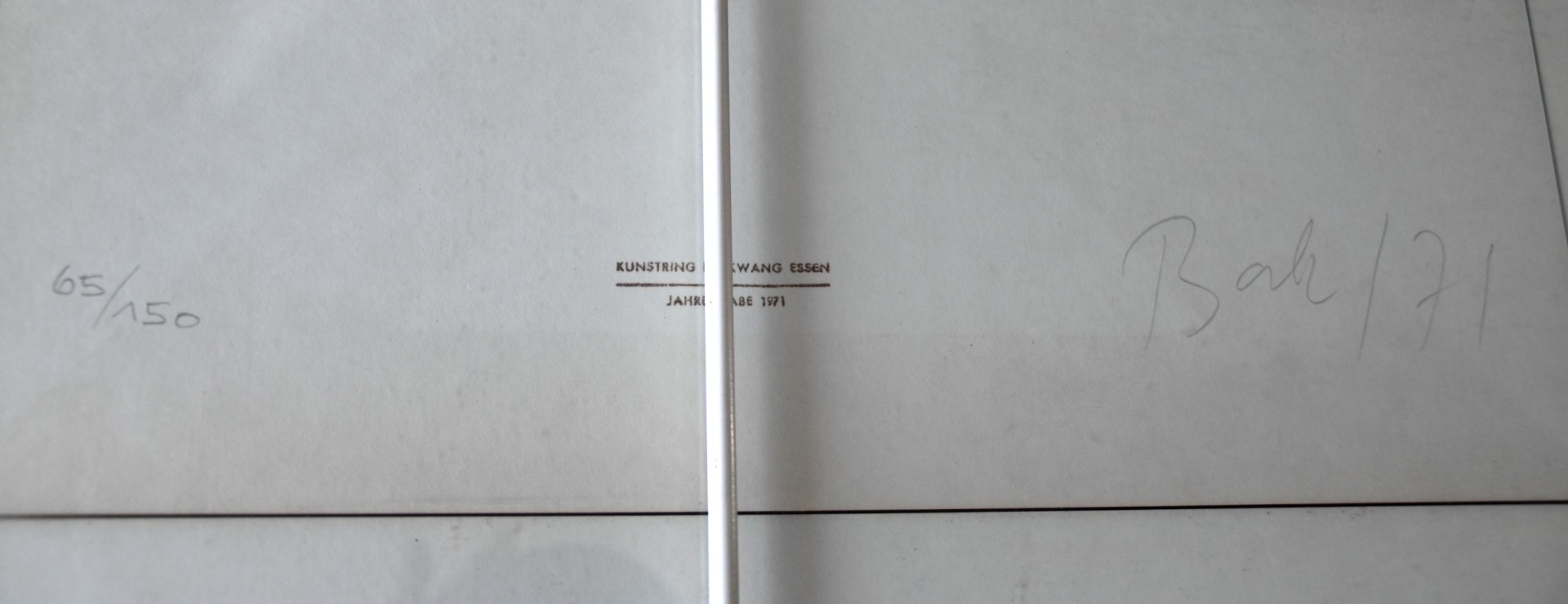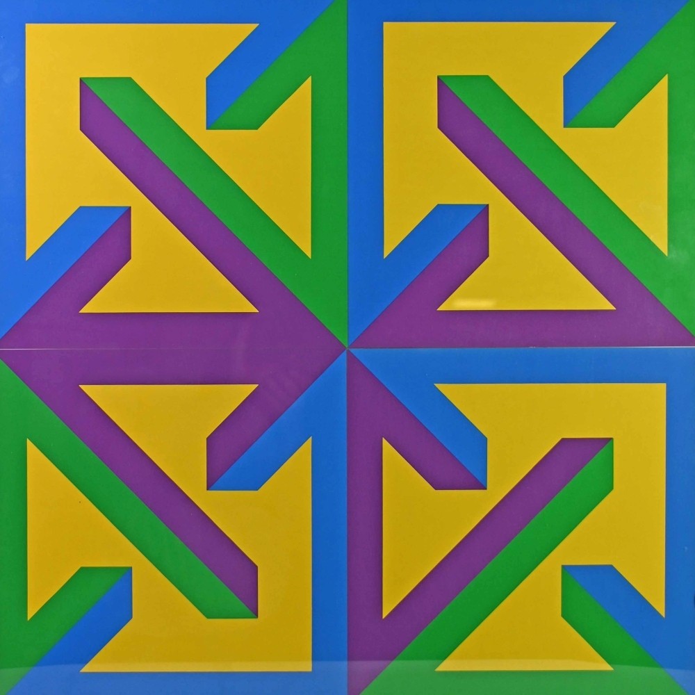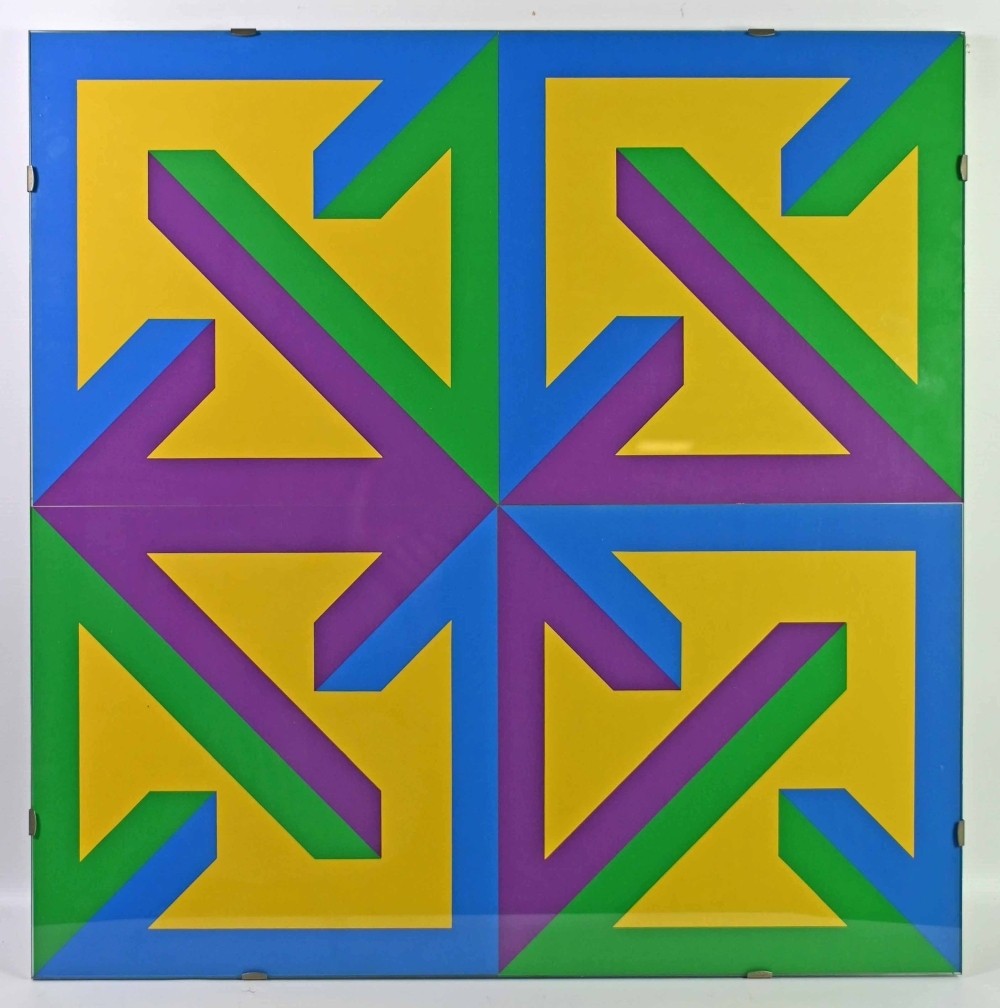 BAK Imre (1939 Budapest) ''Untitled'', abstrakte Komposition in den Farben Blau/Lila/Gelb/Grün, Gesamtkomposition bestehend aus vier einzelnen Serigraphien, jeweils 30x30cm, rückseitig signiert und datiert 1971, Exemplar 65/150, insgesamt 60x60cm, R *Bak studierte an der Ungarischen Akademie für Bildende Künste und gehört zu einer Gruppe ungarischer Künstler, die von den lebendigen Farben des Impressionismus und den Formen des Kubismus inspiriert wurden. Zudem sammelte der Künstler Inspiration auf Reisen, etwa nach Moskau, St. Petersburg oder Stuttgart. Baks Werke waren bereits in zahlreichen Ausstellungen zu sehen, zudem erhielt er eine Vielzahl an Auszeichnungen. Er war Teilnehmer der documenta 4. Der Künstler ist Ehrenmitglied der Akademie für Kunst und Literatur in Budapest.*