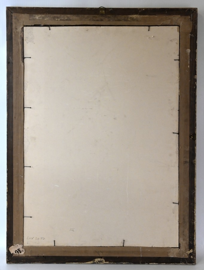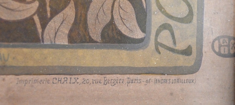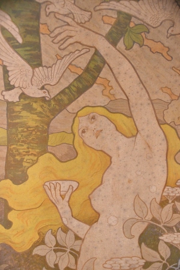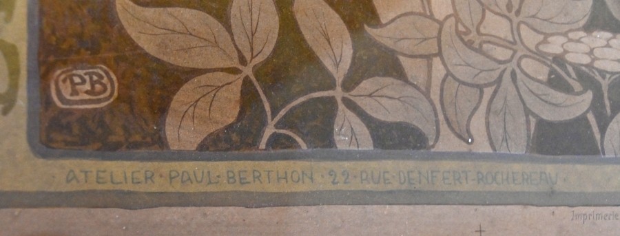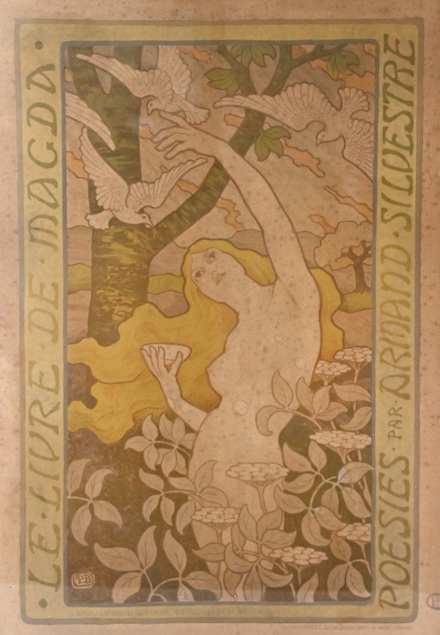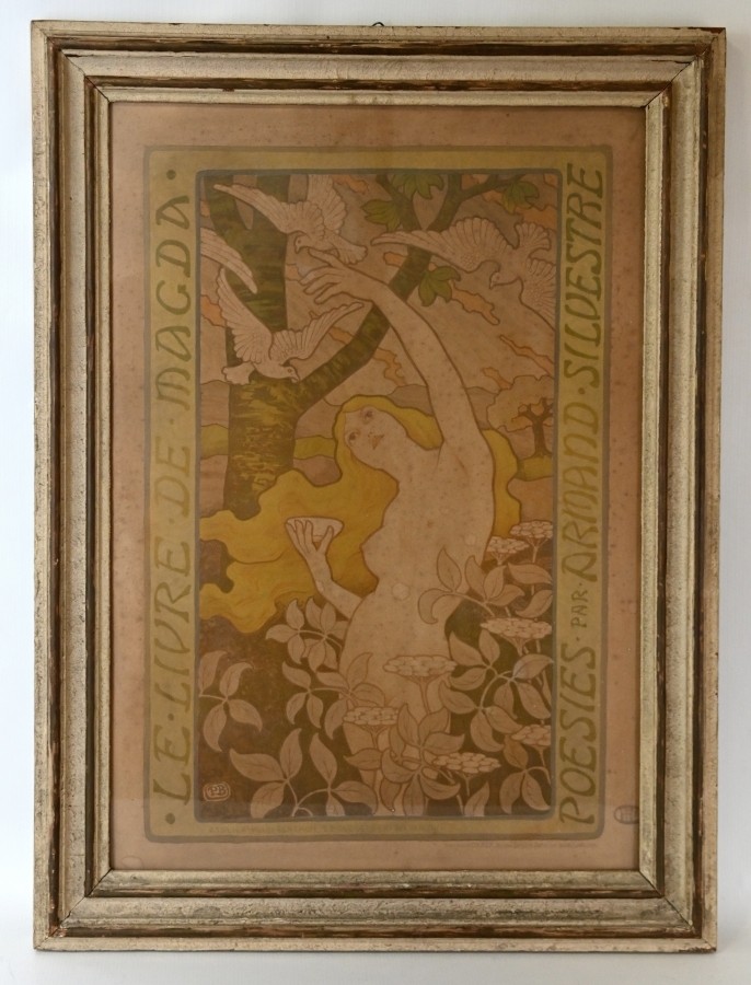 BERTHON Paul Emile (1872 Chartrettes, Frankreich - 1909 Paris) ''Le Livre de Magda'' (1898) stehender weiblicher Akt mit langem blondem Haar, hinter Hortensienbusch, in der rechten Hand eine Schale, mit der Linken flatternde Tauben fütternd, im Hintergrund Landschaft mit Bäumen, Farblithographie um 1900 für den Gedichtband ''Le livre de Magda'' von Paul Armand Silvestre (1837-1901), Zustand vor der Beschriftung, links unten im Stein monogrammiert, 57x38cm (Abb.), 75,5x55cm (Rahmen), fleckig, R