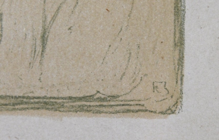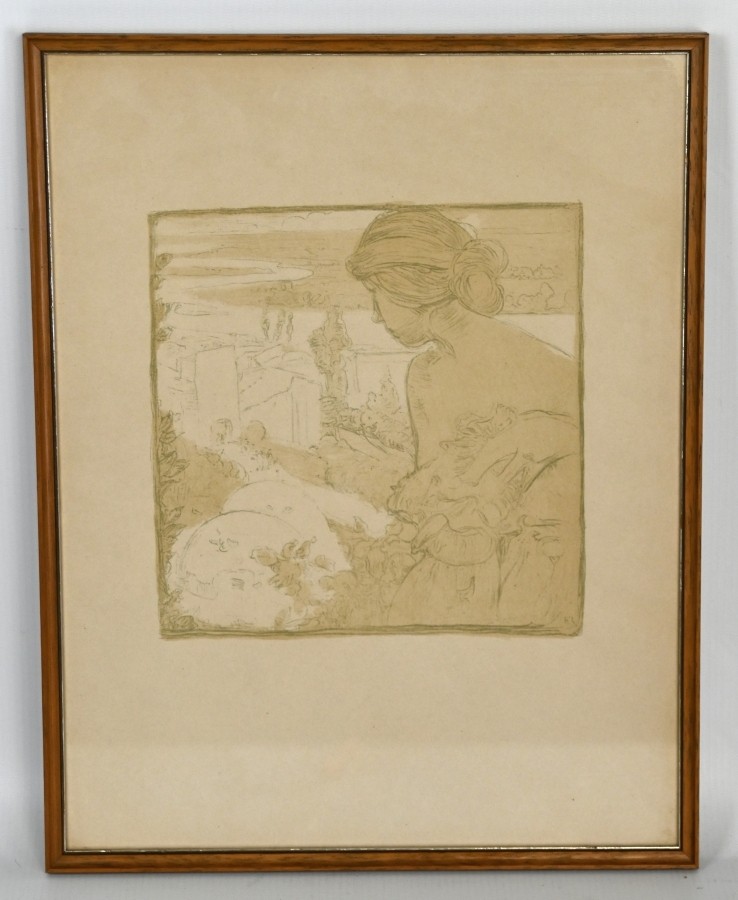 BRANGWYN Frank (1867 Brügge, Belgien - 1956 Ditchling, Vereinigtes Königreich) ''Junge Frau'' Halbfigur im verlorenen Profil den Blick auf eine arkadische Landschaft gerichtet, Lithographie in Oliv, im Stein rechts unten monogrammiert, aus dem Mappenwerk der Insel, das 1900 erschien, die Lithographie selbst wurde 1899 geschaffen, 19,5x19cm (Abb.), 35,8x28,5cm (Blatt), R