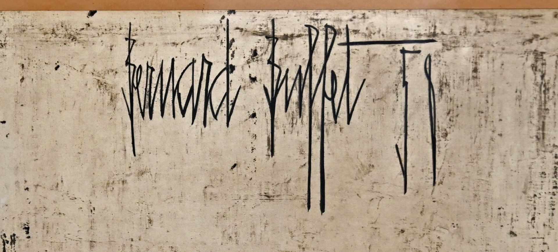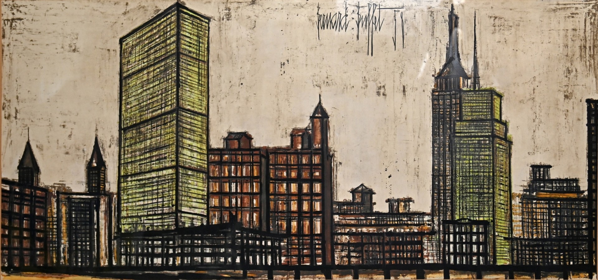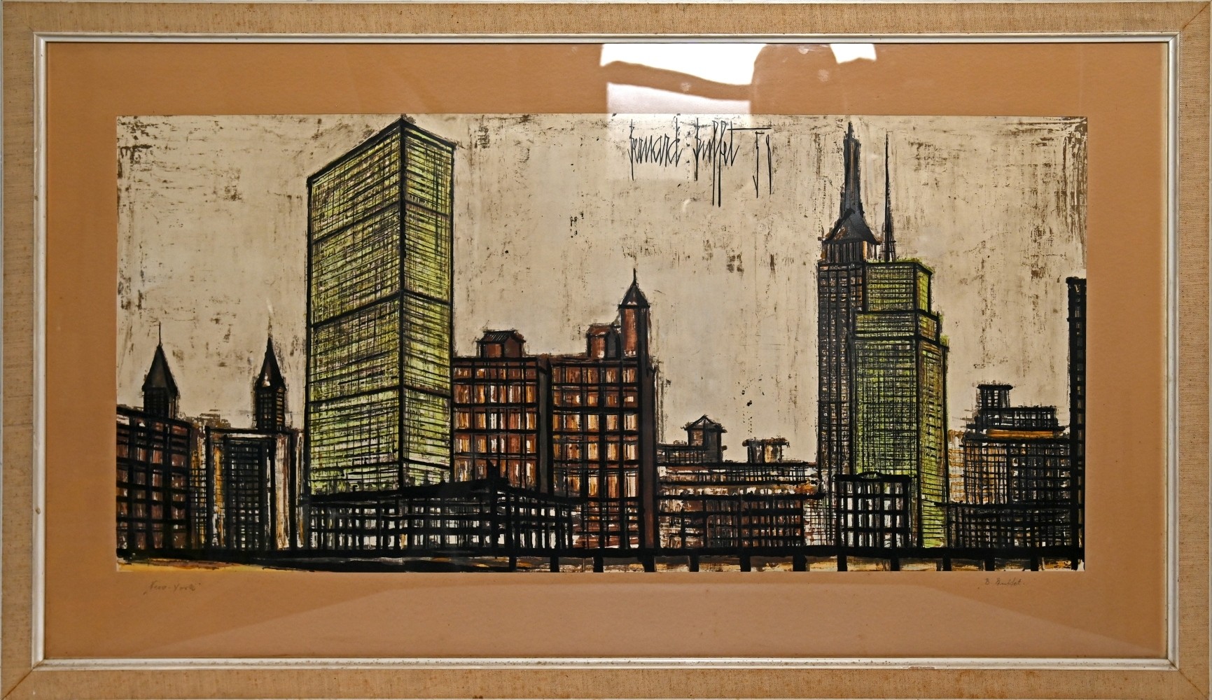 BUFFET Bernhard (1928 Paris, Frankreich - 1999 Tourtour, Provence-Alpes-Côte d'Azur, Frankreich) ''New York'' Silhouette der Stadt am Hudson, Farblithographie mit Schriftzug und Datierung ''1958'' im Himmel, PP, 43x91cm, Rahmen (66x113cm) *Buffet studierte Kunstgeschichte am Lycée Carnot und an der École des Beaux-Arts in Paris. Er schloss sich mit weiteren Malern zur Gruppe ''L'homme-témoin'' zusammen und gehörte zur Szene der künstlerischen Avantgarde. Seine Werke sind in Museen, wie beispielsweise der Tate Gallery in London, dem Kunstmuseum Basel oder dem Musée National d'Art Moderne in Paris, ausgestellt.*