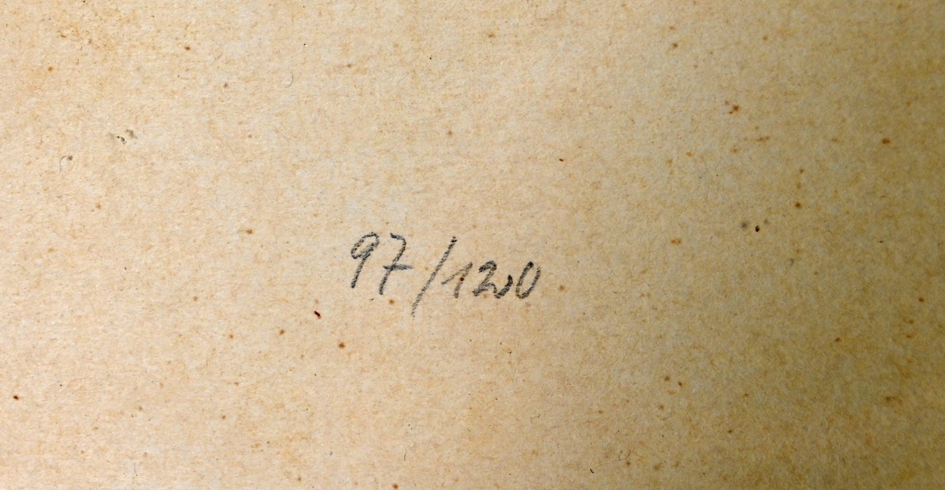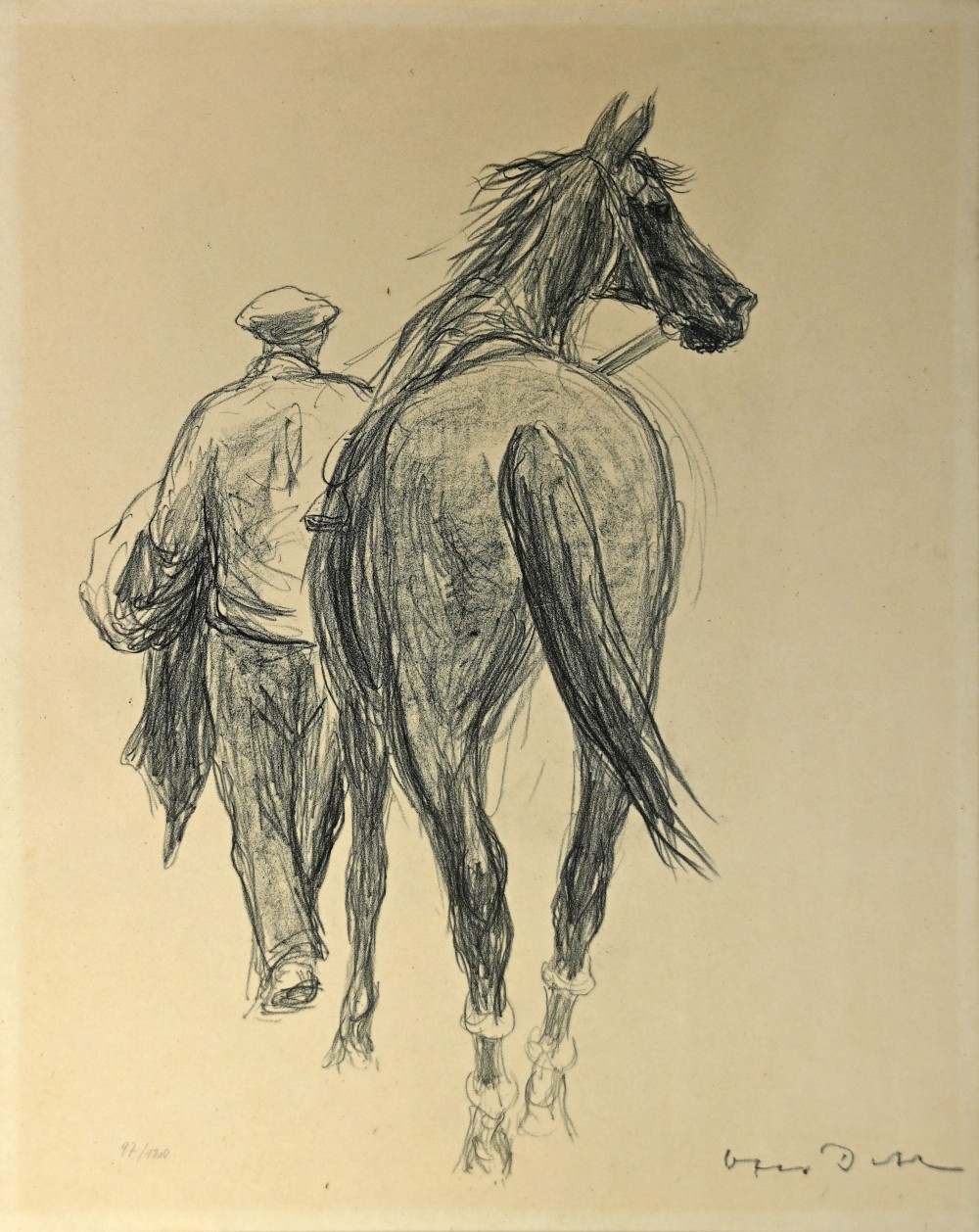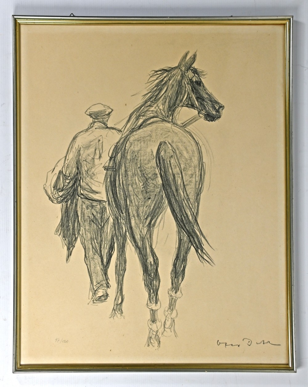 DILL Otto (1884 Neustadt an der Weinstraße - 1957 Bad Dürkheim) ''Pferd'', das von einem Mann geführt wird und nach rechts blickt, der Betrachter blickt von hinten auf die beiden, Lithographie, unten rechts in der Platte signiert, Exemplar 97/120, 51x40,5cm, R *Dill absolvierte eine Lehre als Verlagskaufmann und studierte Malerei an der Münchner Akademie. Dort war er Meisterschüler des Tiermalers Heinrich von Zügel. Dill arbeitete als freischaffender Künstler und war in zahlreichen Ausstellungen vertreten. Er war Mitglied der Münchner Sezession und erlangte 1924 den Professorentitel. Seine Werke befinden sich in zahlreichen öffentlichen Sammlungen und Museen, wie dem Museum Pfalzgalerie Kaiserslautern, in den Bayerischen Staatsgemäldesammlungen München, der Städtischen Galerie im Lenbachhaus München oder im Centre Georges Pompidou in Paris.*