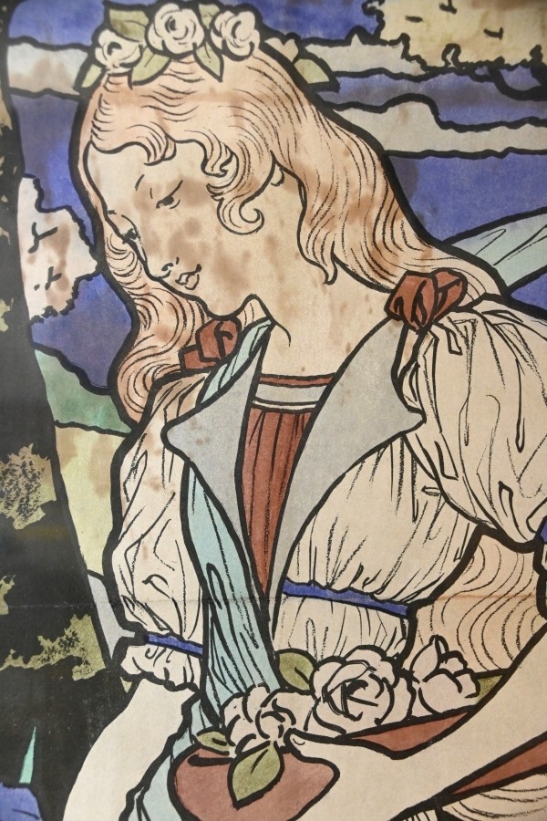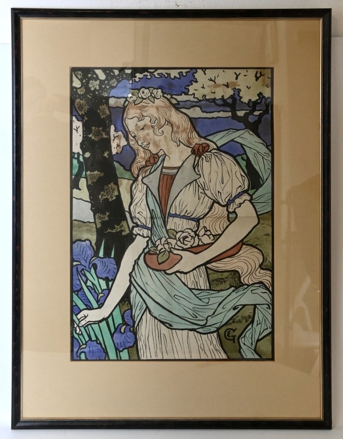 GRASSET Eugène Samuel (1845 Lausanne, Frankreich - 1917 Sceaux bei Paris, Frankreich) ''Der Frühling'' Plakat für die Ausstellung dekorativer Kunst in der Crafton Gallery, London (1893), Farblithographie, rechts unten im Stein monogrammiert, 65x45cm (Abb.), PP, 92,5x70cm (Rahmen), Stockflecken, Mittelfalz