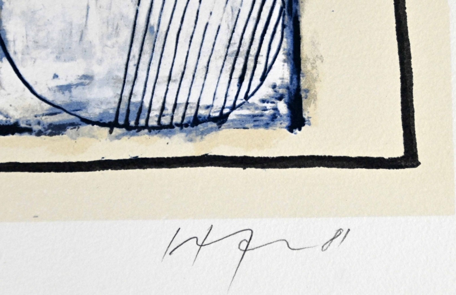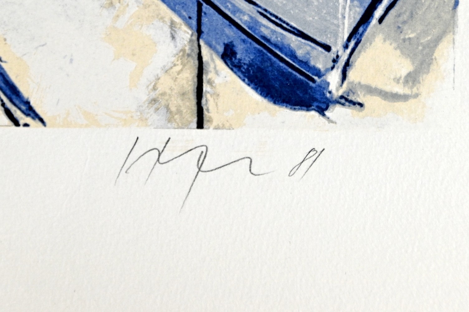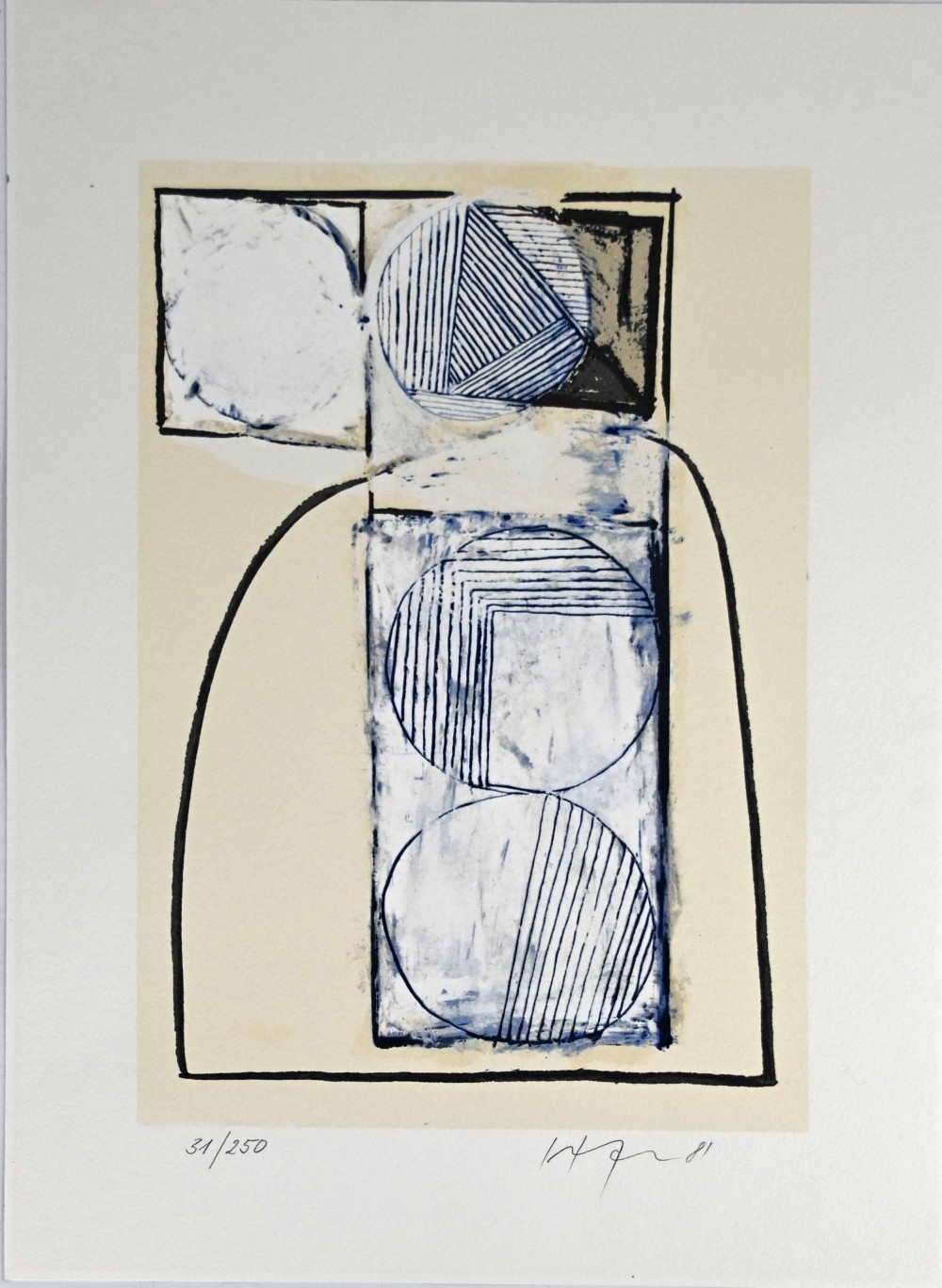 HOFSCHEN Edgar (1941 Tapiau, Ostpreußen/Russland - 2016 Wuppertal) 2 Graphiken: ''Abstrakte Komposition'', Farblithographie auf Velin, rechts unten signiert, (19)81 datiert, links unten nummeriert 31/250, 29,5x21,5cm; ''Abstrakte Komposition'' mit Kreisen, Farblithographie auf Velin, rechts unten signiert, (19)81 datiert, links unten nummeriert 31/250, 29,5x21cm (Abb.) *Hofschen studierte Pädagogik in Wuppertal, Kunstgeschichte und Philosophie in Köln und nahm 1972 ein Studium der Malerei an der Kunstakademie Düsseldorf auf. 1977 nahm Hofschen an der documenta 6 in Kassel teil. Sein künstlerisches Werk wird der analytischen Malerei zugerechnet, einer reduktionistischen Variante der abstrakt, ungegenständlichen Malerei, die darauf abzielt, allein das Material eines Bildwerks, also etwa Leinwand und Farbe bzw. Farbauftrag, für sich sprechen zu lassen, ohne etwas anderes abbilden oder ausdrücken zu wollen.*