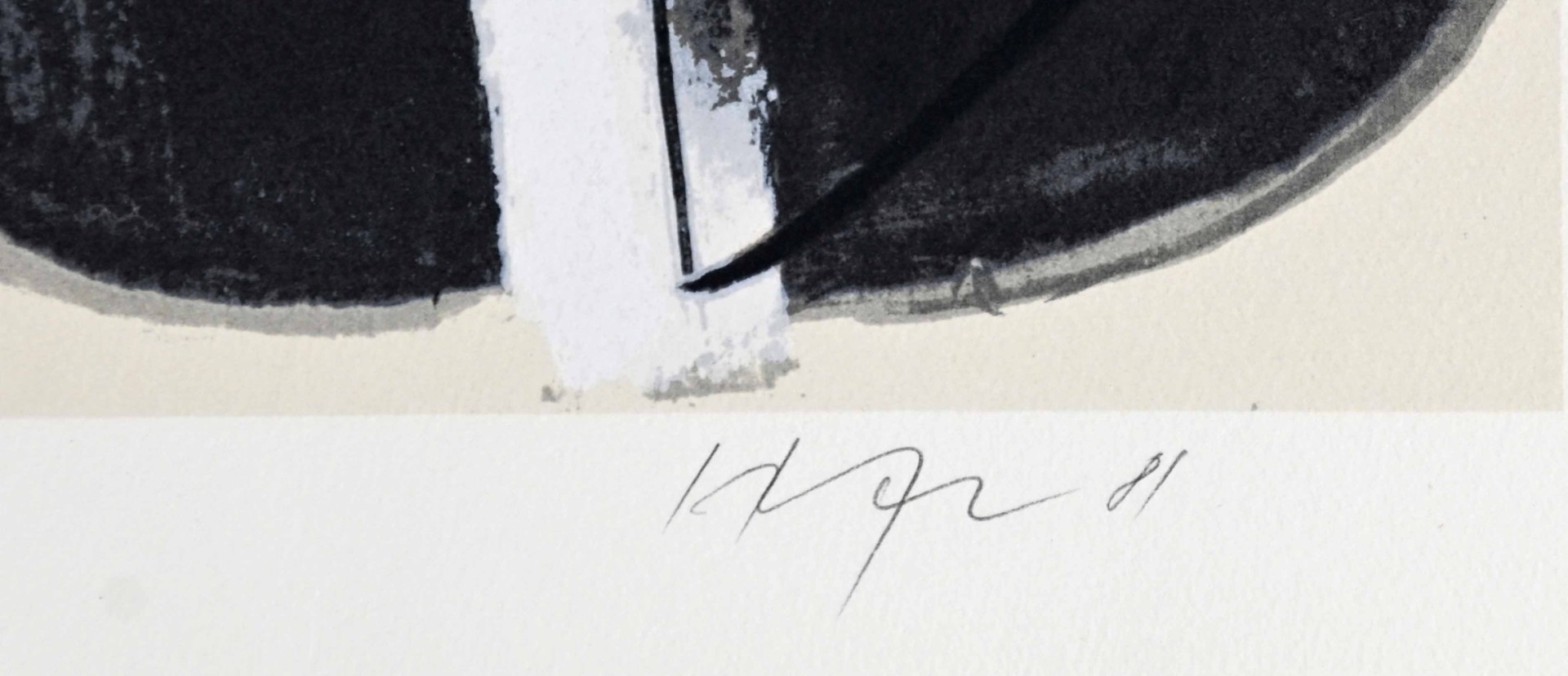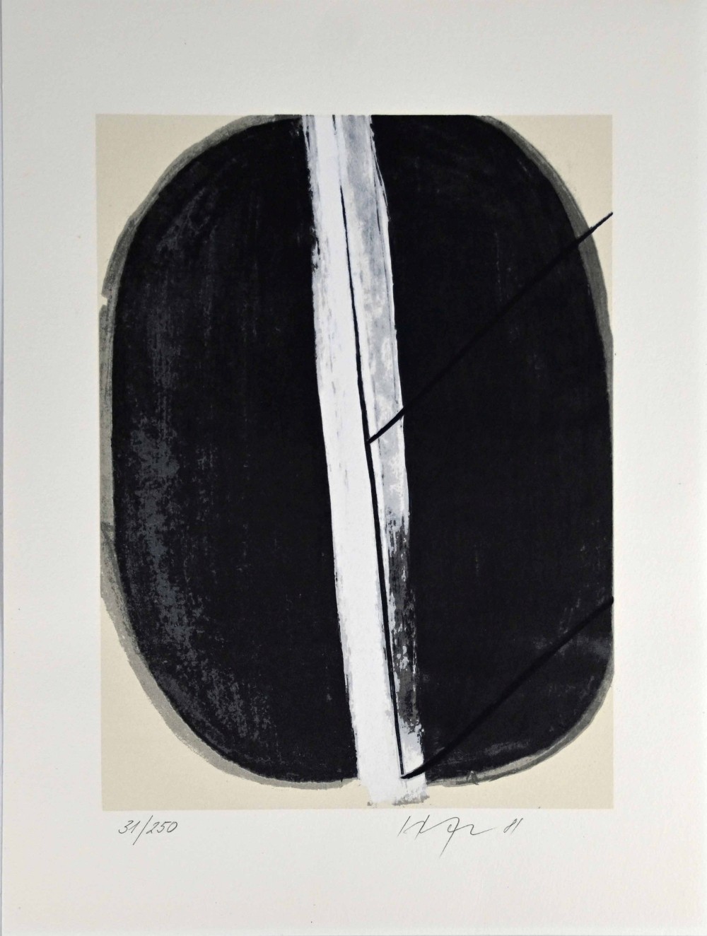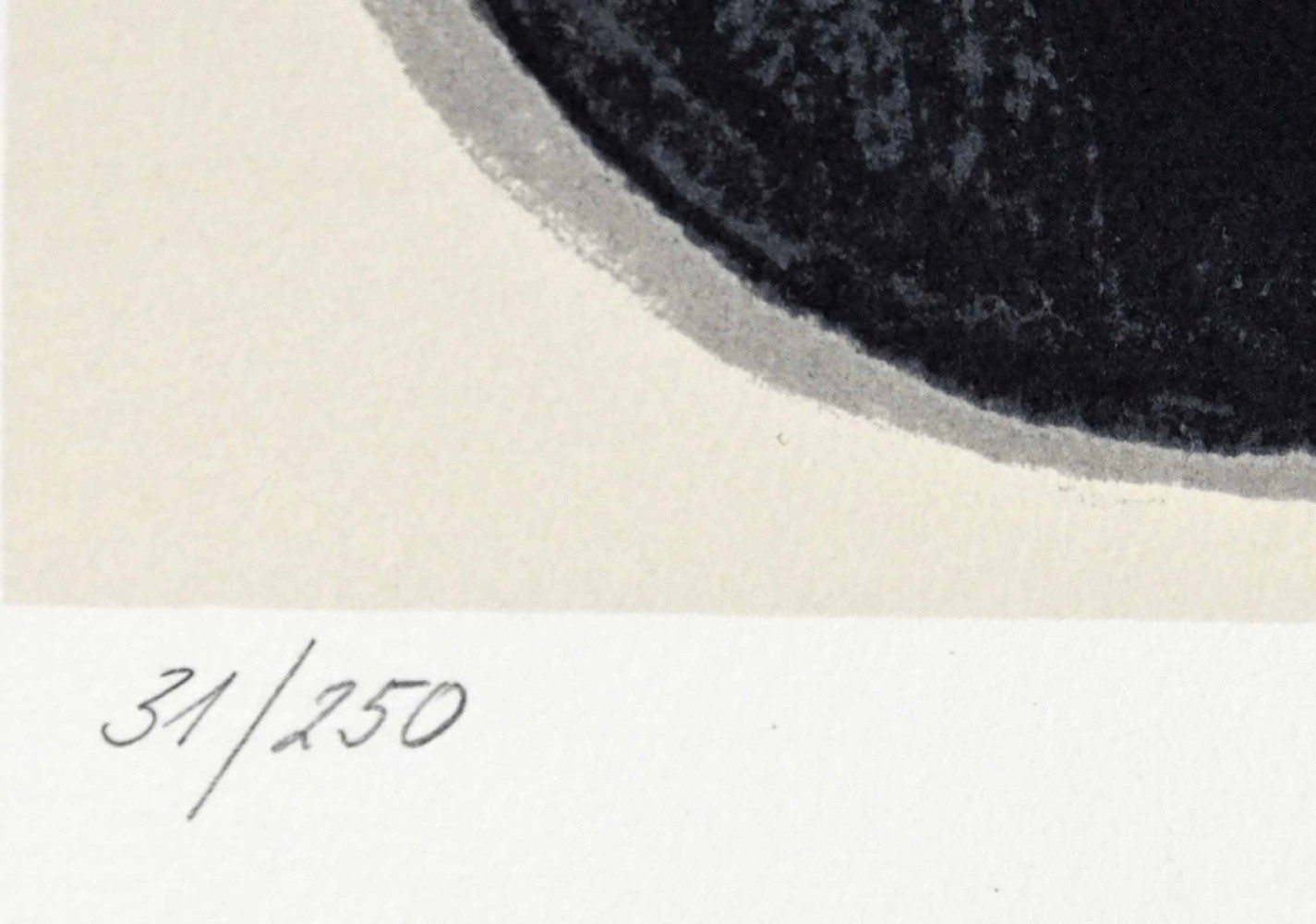 HOFSCHEN Edgar (1941 Tapiau, Ostpreußen/Russland - 2016 Wuppertal) 3 Graphiken: ''Abstrakte Komposition'', Farblithographie auf Velin, rechts unten signiert, (19)81 datiert, links unten nummeriert 31/250, 29,5x21cm (Abb.); ''Abstrakte Komposition'' mit Worten, Farblithographie auf Velin, rechts unten signiert, (19)81 datiert, links unten nummeriert 31/250, 29,5x21cm (Abb.); ''Abstrakte Komposition'', Farblithographie auf Velin, rechts unten signiert, (19)80 datiert, links unten bezeichnet a.p., 29,5x21cm (Abb.) *Hofschen studierte Pädagogik in Wuppertal, Kunstgeschichte und Philosophie in Köln und nahm 1972 ein Studium der Malerei an der Kunstakademie Düsseldorf auf. 1977 nahm Hofschen an der documenta 6 in Kassel teil. Sein künstlerisches Werk wird der analytischen Malerei zugerechnet, einer reduktionistischen Variante der abstrakt, ungegenständlichen Malerei, die darauf abzielt, allein das Material eines Bildwerks, also etwa Leinwand und Farbe bzw. Farbauftrag, für sich sprechen zu lassen, ohne etwas anderes abbilden oder ausdrücken zu wollen.*